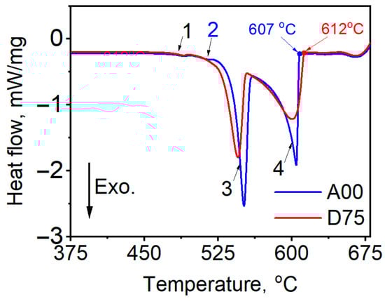 Comparison of the differential scanning calorimetry (DSC) curves between A00 and D75 alloy. Peak 1 corresponds to the formation of the Cu-rich Al2Cu phase during cooling. Peak 2 is associated with the precipitation of the β-Fe intermetallic phase. Peak 3 represents the solidification of the eutectic constituent (Si + α-Al). Peak 4 corresponds to the solidification of the primary α-Al phase.