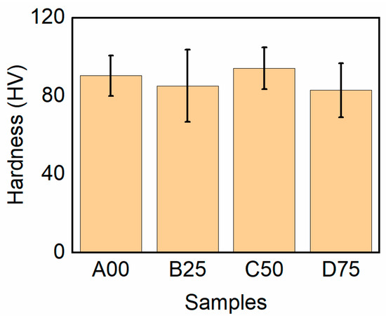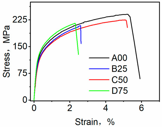 Figure 7 shows the tensile stress–strain curves at room temperature for the four designed alloys with varying Sc/Zr additions. Alloy A00 exhibits a yield strength (YS) of 121 MPa, an ultimate tensile strength (UTS) of 241 MPa, and an elongation (EL) of 5.2%. With the addition of 0.25 wt.% Sc/Zr, Alloy B25 shows a slight increase in YS to 125 MPa, but a decrease in UTS to 209 MPa and EL to 2.7%. When the Sc/Zr content is increased to 0.5 wt.%, Alloy C50 achieves optimized mechanical performance, with a YS of 132 MPa, a UTS of 233 MPa, and an EL of 5.1%. This improvement is attributed to the optimal grain refinement and eutectic modification effects discussed previously. However, further increasing the Sc/Zr content to 0.75 wt.% in Alloy D75 results in a YS of 141 MPa, but a decrease in UTS to 216 MPa and a minimum EL of 2.3%.