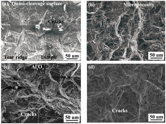 Figure 8 shows the tensile fracture morphologies of the as-cast Al-5Si-1.2Cu-0.5Mg-0.02Sr alloys with different Sc/Zr additions. In Alloy A00 (Figure 8a) without Sc/Zr refinement, the fracture surface displays numerous cracks, large quasi-cleavage facets, and a few tear ridges and dimples, suggesting a predominantly brittle-ductile fracture. After adding 0.25 wt.% Sc/Zr (Alloy B, Figure 8b), the quasi-cleavage areas decrease while dimples and dense tear ridges become more evident, accompanied by some microporosity, indicating a mixed brittle fracture mode. For Alloy C with 0.5 wt.% Sc/Zr (Figure 8c), the fracture surface presents both quasi-cleavages and fine dimples, with visible cracks and Al2O3 inclusions, showing a transitional fracture behavior. When the Sc/Zr addition increases to 0.75 wt.% (Alloy D, Figure 8d), the fracture surface is mainly characterized by numerous small quasi-cleavage facets, a few fine cracks and fine dimples, indicating that the fracture mode has shifted toward a more brittle-ductile mechanism.