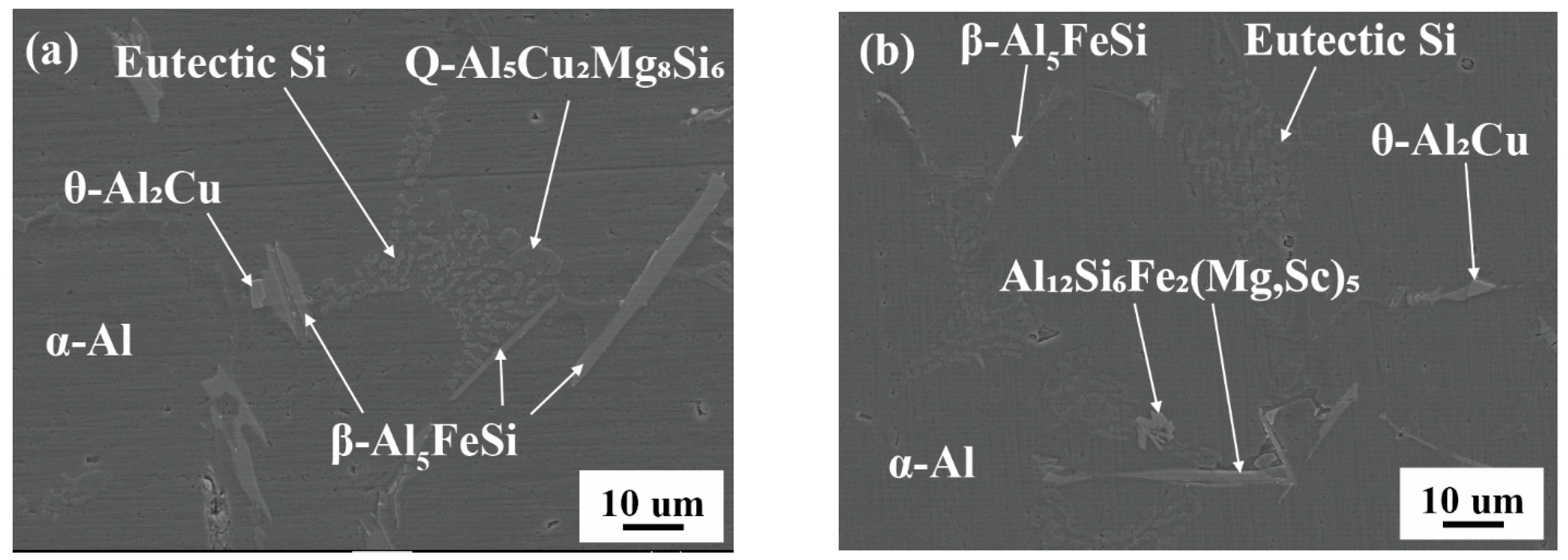 - Tzeng, Y.-C.; Wu, C.-T.; Bor, H.-Y.; Horng, J.-L.; Tsai, M.-L.; Lee, S.-L. Effects of scandium addition on iron-bearing phases and tensile properties of Al–7Si–0.6Mg alloys. Mater. Sci. Eng. A 2014, 593, 103–110. [Google Scholar] [CrossRef]