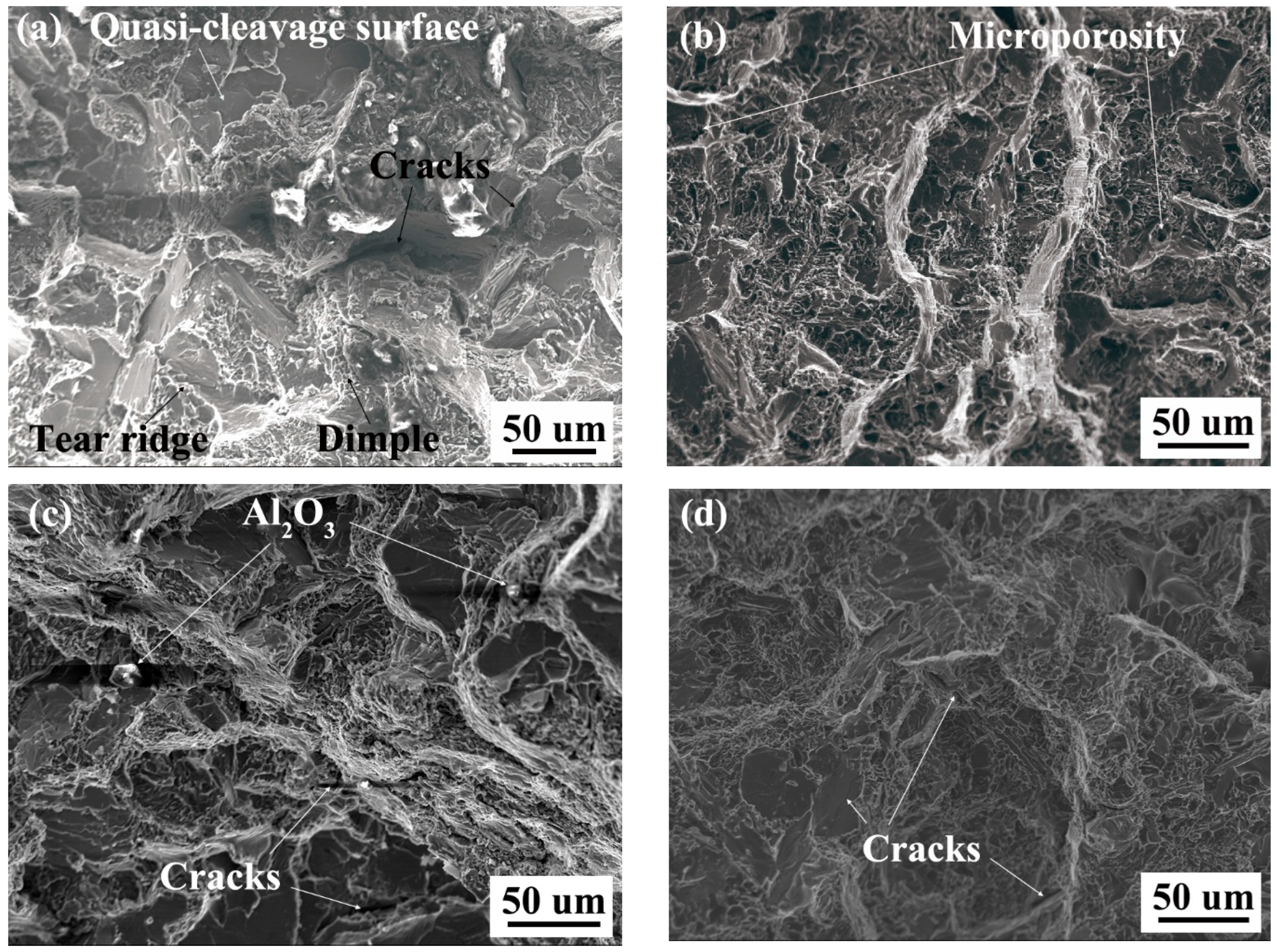 - Moderate Sc/Zr additions (0.25–0.5 wt.%) yield optimal mechanical balance, whereas excessive additions (>0.5 wt.%) promote silicide and Fe-rich intermetallic formation, reducing ductility and promoting brittleness. Therefore, controlled Sc/Zr additions below 0.5 wt.% are recommended to achieve an optimal combination of strength, ductility, and microstructural stability.