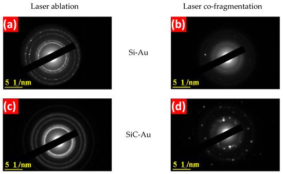 To visualize the shape and size of the laser-synthesized plasmonic silicon-based NCs, they were investigated by means of TEM (Figure 1). One can see quite homogeneous size distributions across all types of NPs prepared by both direct LA and LcF approaches, which have a perfectly spherical shape (Figure 1). To reveal the structure of the laser-synthesized NCs, their diffraction patterns were obtained by means of TEM (Figure 2). Quite similar images related to the nanostructures prepared by the LA and LcF approaches were observed (Figure 2). Indeed, the NCs formed by the direct LA approach showed several distinct rings related to different crystalline planes. Both Si-Au and SiC-Au NCs synthesized by the direct LA had four diffraction rings associated with the following crystalline planes of gold: (111), (200), (220), and (311). It also correlated well with (111), (200), (220), (311), and (222) gold crystalline planes for the Si-Au NCs prepared at different laser ablation times, as it was recently justified by X-ray diffraction (XRD) technique [36]. At the same time, the LcF-formed nanostructures demonstrated less pronounced crystalline structure in comparison with the LA ones. Thus, it indicated that different structures of the NCs were formed by these two different methods, which might be related to different mechanisms of NC synthesis. Here, one can hypothesize that direct ablation can result in a larger number of gold nanoclusters released from the solid target. Their further agglomeration can result in the formation of different nanocrystalline gold structures merged with some silicon atoms. Moreover, the silicon nanoclusters can also interact with the dissolved oxygen molecules. As a consequence, according to the X-ray photoelectron spectroscopy (XPS), different silicon (sub-)oxides and even gold oxide can be formed upon high-energy ultrashort pulses [36]. Contrary to this, the mixture of the semiconductor and metallic NPs irradiated by the same laser pulses can consist of homogeneously dispersed nanoclusters of different elements. Thus, it can lead to the restriction of the long-range order, considerably limiting the size of the formed gold nanocrystals.