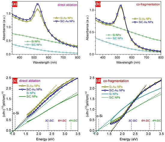 (a,b) Absorbance spectra and (c,d) Tauc plot of Si-Au and SiC-Au NCs prepared by: (a,c) direct laser ablation and (b,d) laser co-fragmentation approaches.