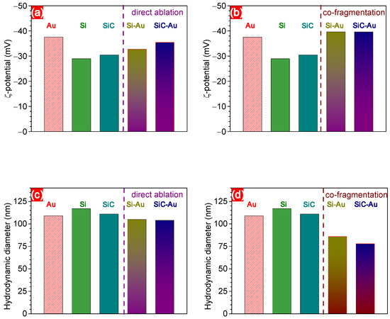 (a,b) ζ-potential and (c,d) hydrodynamic diameter of Si-Au and SiC-Au NCs prepared by: (a,c) direct laser ablation and (b,d) laser co-fragmentation approaches.
