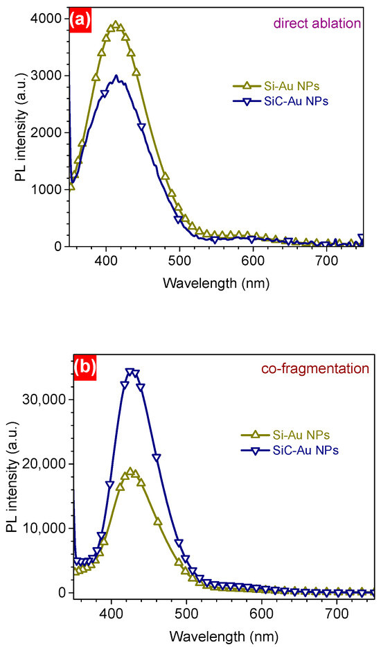 The following supporting information can be downloaded at: https://www.mdpi.com/article/10.3390/cryst15110982/s1, Figure S1: Fitting of the PL spectra of: Si-Au (a,b) and SiC-Au (c,d) NCs prepared by: (a,c) direct laser ablation and (b,d) laser co-fragmentation approaches; Figure S2: EPR spectra of Si-Au NCs prepared by: (a) direct laser ablation and (b) laser co-fragmentation approaches.