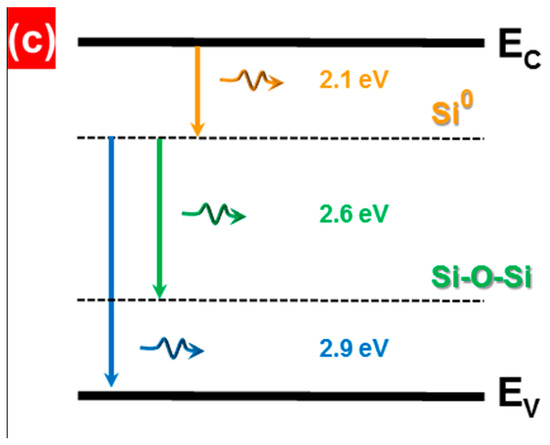 In the case of QCE, PL is mainly observed for nanocrystals smaller than 5 nm in the red spectral range, whose spectral position and efficiency are considerably dependent on their size [46]. However, in our case, the emission is mainly detected in the blue-violet spectral range with some orange PL (Figure S2), thus, excluding this mechanism. Nevertheless, the observed PL contribution at 590 nm might be associated with the so-called Y-band, whose efficiency is low due to the effective depletion of the number of excited electrons through electron transfer and intraband relaxation [47]. Another mechanism of this PL band can also be related to the Ec → Si0 transition [52,53]. Taking into account the NC synthesis in the oxygen-saturated aqueous medium, they can represent a complex system consisting of nanocrystalline silicon and silicon oxide of different stoichiometry [36]. Hence, the most probable mechanisms of the silicon-based NC photoluminescence in the 350–480 nm range might be mainly related to the direct recombination of the photoexcited charge carriers at the interface of the crystalline silicon nanoclusters and oxide shell via the different surface and interface states in the Si/SiOx system [54]. In particular, some of the aforementioned bands can be due to the following transitions: Si0 → Ev (~430 nm) and Si0 → Si–O–Si (~480 nm) [55]. The transition at 400 nm might be attributed to two-fold coordinated silicon lone-pair centres [54].