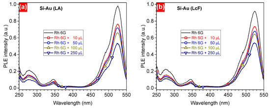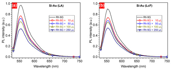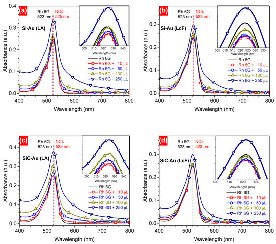 To assess the capability of the laser-synthesized plasmonic silicon-based NCs for colorimetric sensing, the optical properties of the Rh6G organic dye molecules (1 µM) were investigated depending on the amount of added plasmonic NCs (10–250 µL). Here, similar tendencies were found for absorbance, PLE, and PL spectra of Rh6G for all NCs regardless of their composition (Figure 7, Figure 8 and Figure 9). Firstly, a small drop (10 µL) of any plasmonic NC reduced (~5–10%) the absorbance intensity of Rh6G (Figure 7). Then, the increase in the colloids volume (up to 250 µL) resulted in a stronger absorbance of Rh6G (~15–30% compared to pure Rh6G) (Figure 7). At low concentrations of the colloidal suspensions of the Si–Au and SiC–Au NCs (10 µL), the absorption of Rh6G decreased by ~5–10%, which can be attributed to the partial adsorption of dye molecules onto the NP surface and local changes in the dielectric environment. Upon increasing the concentration (250 µL), the absorption intensity increased by ~15–30% compared to the pristine dye. This enhancement can originate from the spectral overlapping between the absorption maxima of Rh6G (525 nm) and the plasmonic band of the NCs (523−525 nm), which can lead to localized surface plasmon resonance (LSPR)-induced field amplification and increased transition probability for the dye.