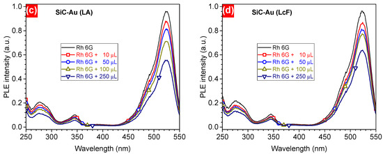 Influence of Si-Au (a,b) and SiC-Au (c,d) NCs prepared by: (a,c) direct laser ablation and (b,d) laser co-fragmentation approaches on PLE spectra of rhodamine 6G (emission wavelength is 560 nm).