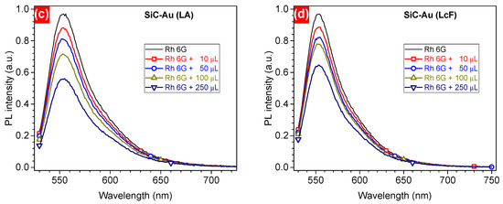 Influence of Si-Au (a,b) and SiC-Au (c,d) NCs prepared by: (a,c) direct laser ablation and (b,d) laser co-fragmentation approaches on PL spectra of rhodamine 6G (excitation wavelength is 525 nm).
