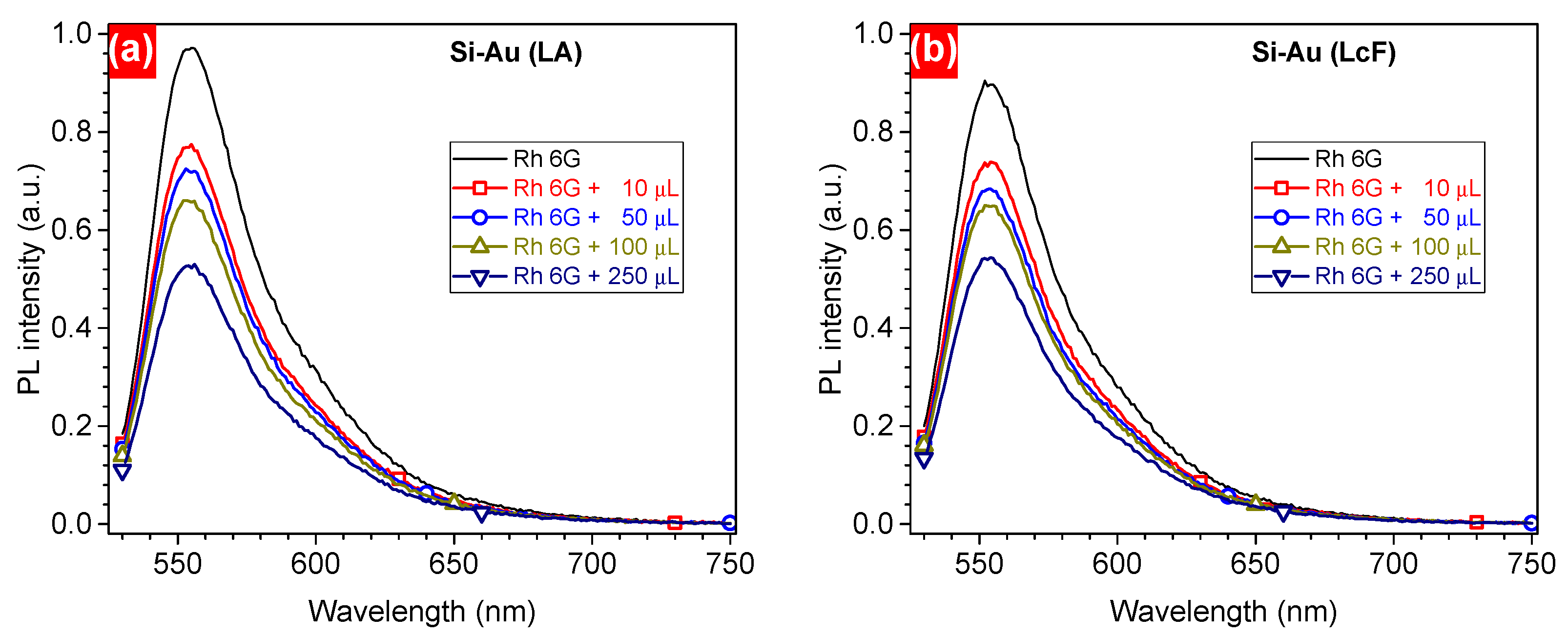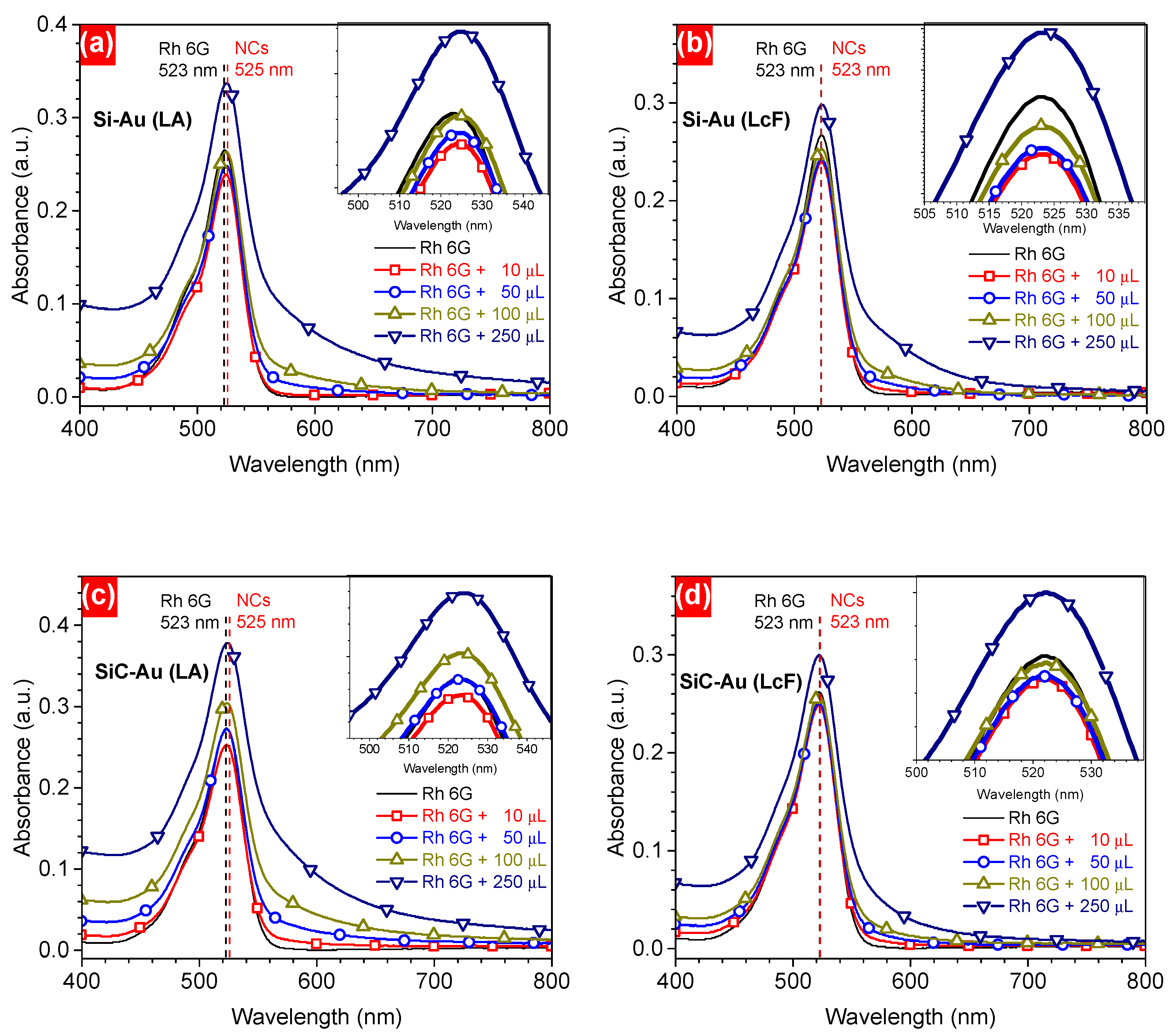 - Competitive absorption between Rh6G (~525 nm) and the Au plasmon band (523–525 nm) leads to an initial decrease in intensity at low nanoparticle concentrations;