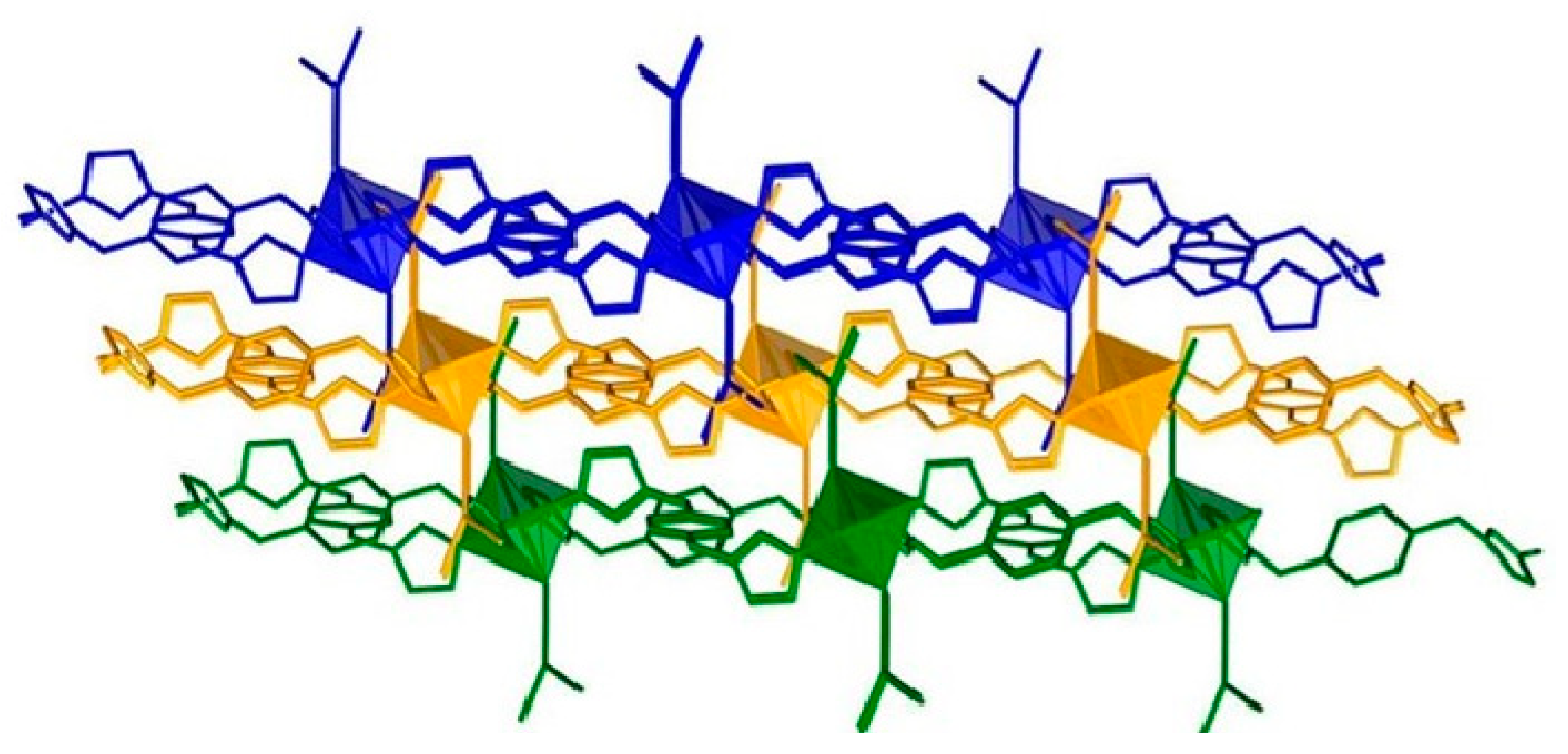 - Yang, J.-X.; Zhang, X.; Qin, Y.Y.; Yao, Y.G. N-Donor Auxiliary Ligand Influence on the Coordination Mode Variations of V-Shaped Triazole Dicarboxylic Acid Ligand Affording Seven New Luminescent Zn(II) Compounds with Variable Structural Motifs. Cryst. Growth Des. 2020, 20, 6366–6381. [Google Scholar] [CrossRef]