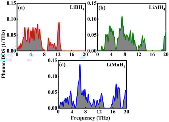 Phonon density of states (DOS) of (a) LiBH4, (b) LiAlH4, and (c) LiMnH4 hydrides.