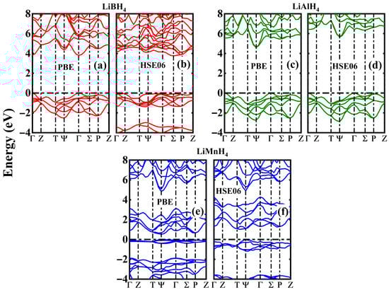Electronic property analysis reveals the band structures of these orthorhombic LiXH4 (X = B, Al, M) compounds, presented in Figure 5a–f. The calculated band gaps of these materials are 3.81 eV for LiBH4, 4.60 eV for LiAlH4, and 0.53 eV for LiMnH4, calculated by GGA-PBE approach. These band gap values confirm that three hydrides are of semiconducting nature. LiBH4 and LiAlH4 have presented wide band gaps, while LiMnH4 possesses a narrow band gap. These variations in band gaps show that substituting the X-site elements can tune the band gap values and the electronic properties. Wide band gap materials (LiBH4 and LiAlH4) are more favorable to be used as insulating layers and charge blocking in energy storage systems; on the other hand the narrow band gap material (LiMnH4) possesses the potential for absorbing visible light, also indicating the facilitation of electron–hole pair generation. In this material, relatively flat valance bands from the Γ to T direction are observed, indicating highly localized electronic states. These localized states arise due to non-bonding of Mn-d and H-p orbitals, which can be seen in the form of limited overlapping along this direction. Such flat electronic states closer to Fermi level give rise to optical absorption in the visible region. Such electronic structure flexibility indicates that these materials have potential for hydrogen storage applications due to their hydride nature, and efficiency for optoelectronic applications such as PV devices.