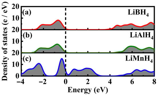 Density of states (DOS) plots of (a) LiBH4, (b) LiAlH4, and (c) LiMnH4 compounds.