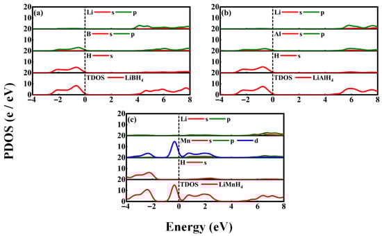 Partial density of states (PDOS) plots of (a) LiBH4, (b) LiAlH4, and (c) LiMnH4 compounds.
