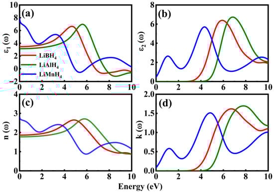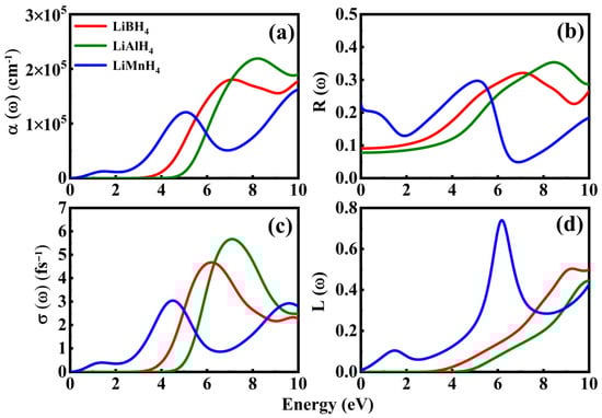 Refractive index versus energy (eV) plots are presented in Figure 8c with static values approaching 2.83 for LiMnH4, 1.86 for LiBH4, and 1.77 for LiAlH4; the highest value is reported for the compound with the narrowest band gap. Furthermore, the peak values for LiAlH4 and LiBH4 compounds are 2.71 and 2.65, respectively. Values of refractive index approach 1, in the same region where the materials show negative values of the real part of the dielectric function, also indicating transparency by n = 1 value of refractive index. Figure 8d represents the extinction coefficient, whose behavior is similar to imaginary part of the dielectric function, with materials’ threshold values starting after their band gap values. One noticeable fact is that LiMnH4 shows a narrow band gap of about 0.53 eV but its value emerges from 0 eV; this is due to the fact that the d-orbital of Mn, which was observed by DOS and PDOS, greatly influences its electronic and optical properties due to higher densities closer to Fermi level. Hence, these factors enlarge the extinction coefficient as well as the imaginary portion of the dielectric function. The peak values of extinction coefficient for LiXH4 (X = B, Al, Mn) hydrides are 1.62, 1.70 and 1.61, respectively, indicating strong potential for PV devices and hydrogen storage capacities.