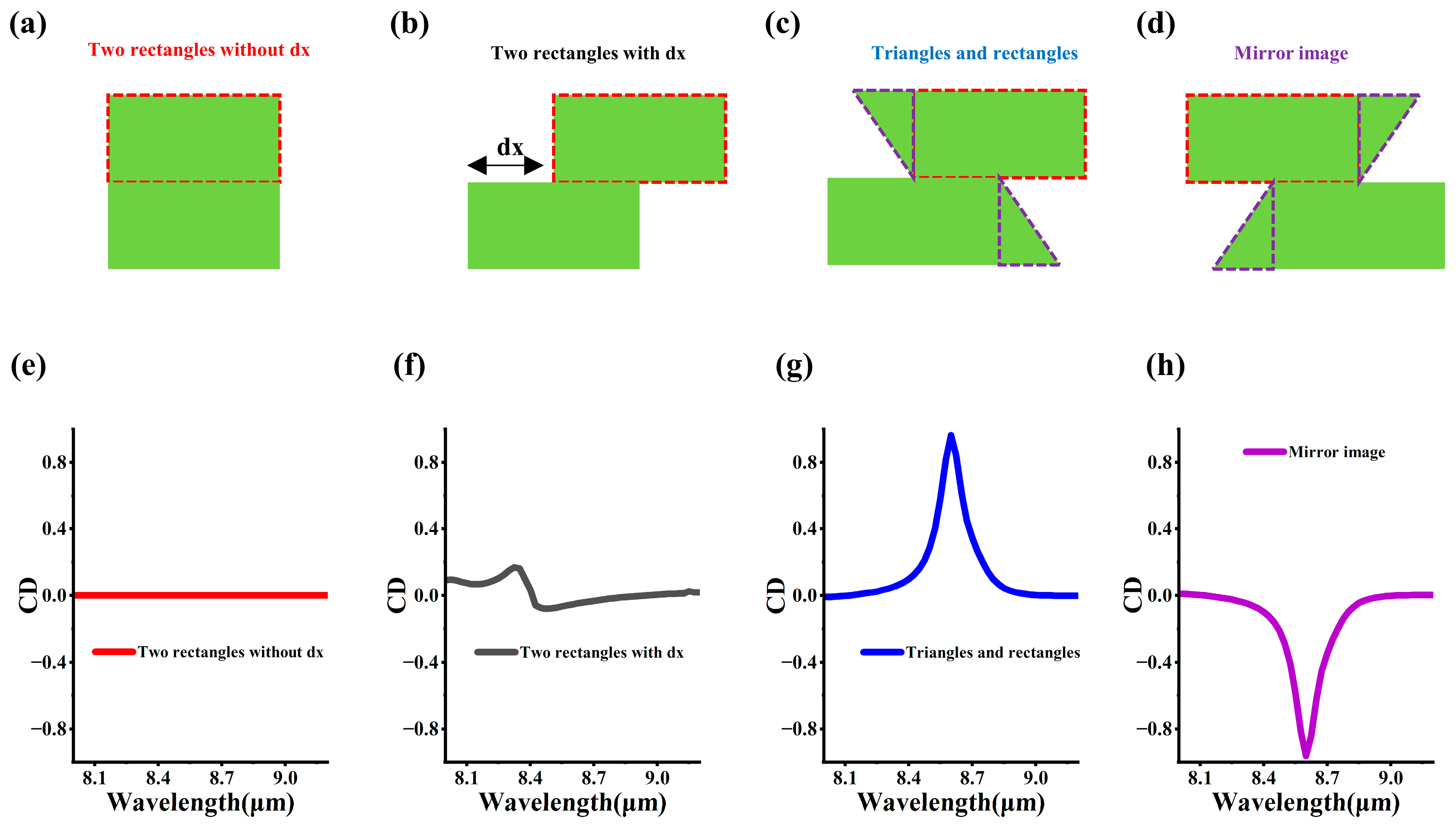 - Shen, Z.; Huang, D.; Lin, X. Dual-band chirality-selective absorbing by plasmonic metasurfaces with breaking mirror and rotational symmetry. Opt. Express 2023, 31, 12. [Google Scholar] [CrossRef]