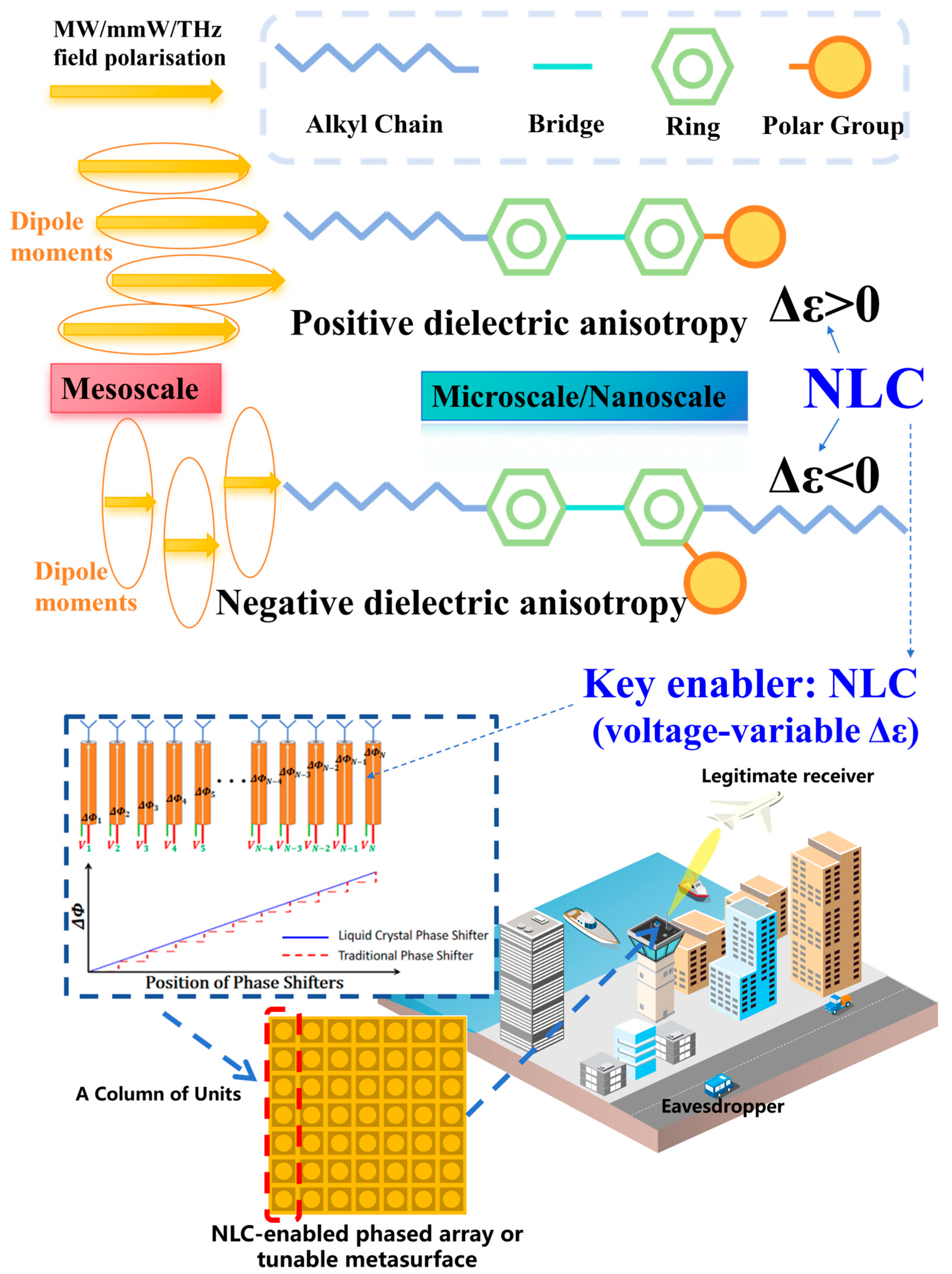 Figure 1. Depiction of phase-shifting mechanisms employing NLCs (composed of rod-like molecules with positive dielectric anisotropy) and their envisioned integration into phased array subsystems or reconfigurable metasurfaces for emerging 5G/6G beam steering applications.