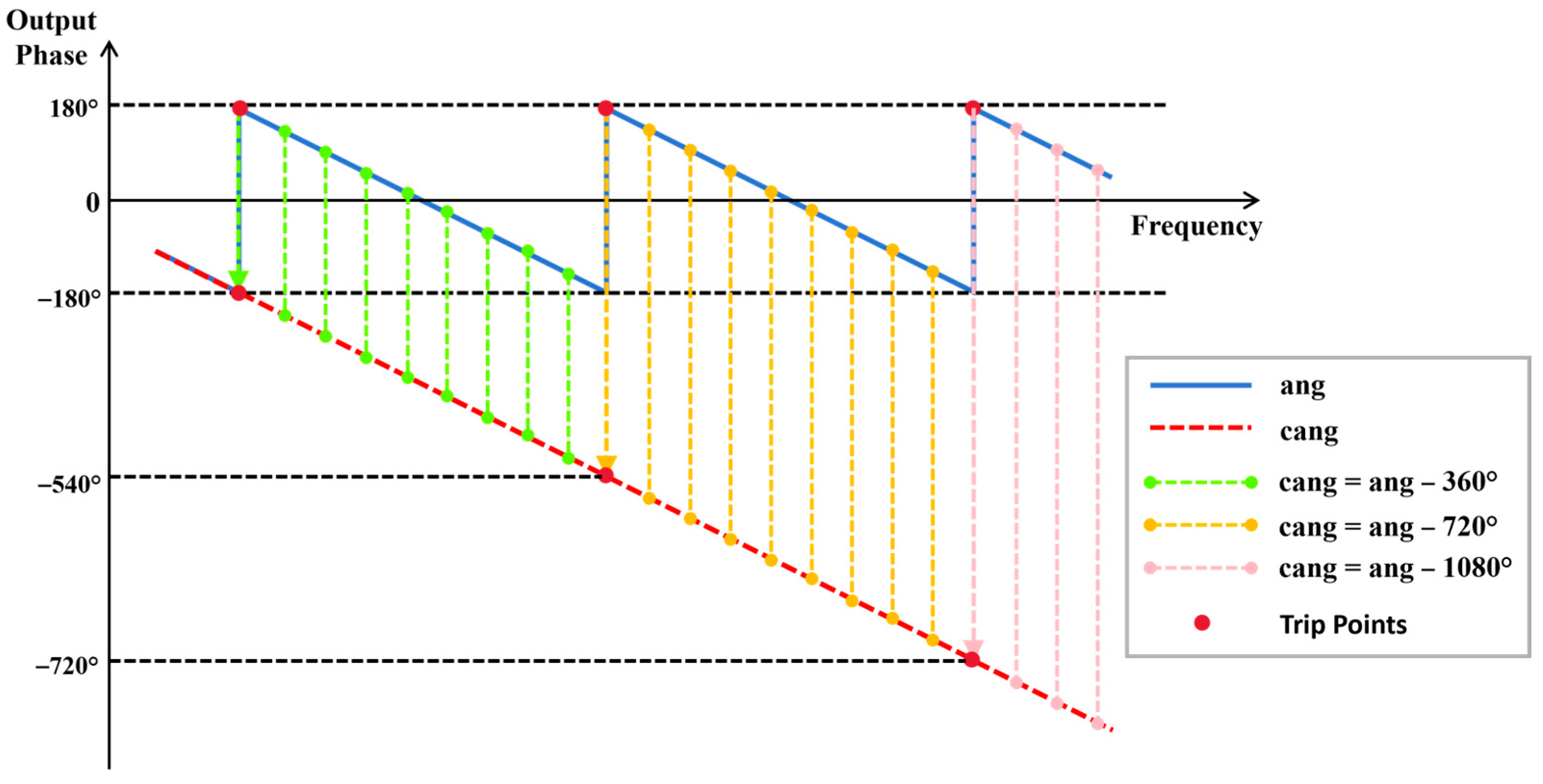 Figure 2. Depiction of relationship between angular (ang) and cumulative angular (cang) representations in phase–frequency responses of NLC-based phase shifters.