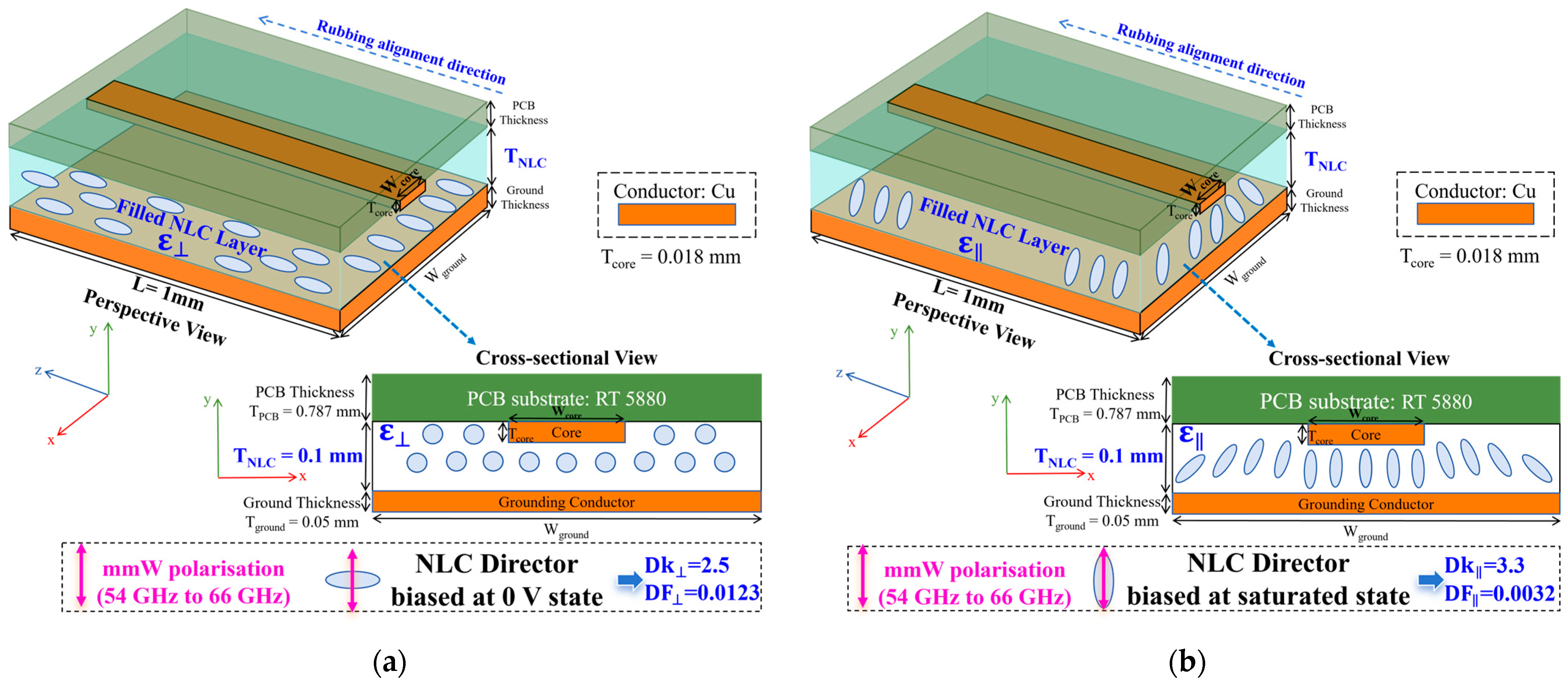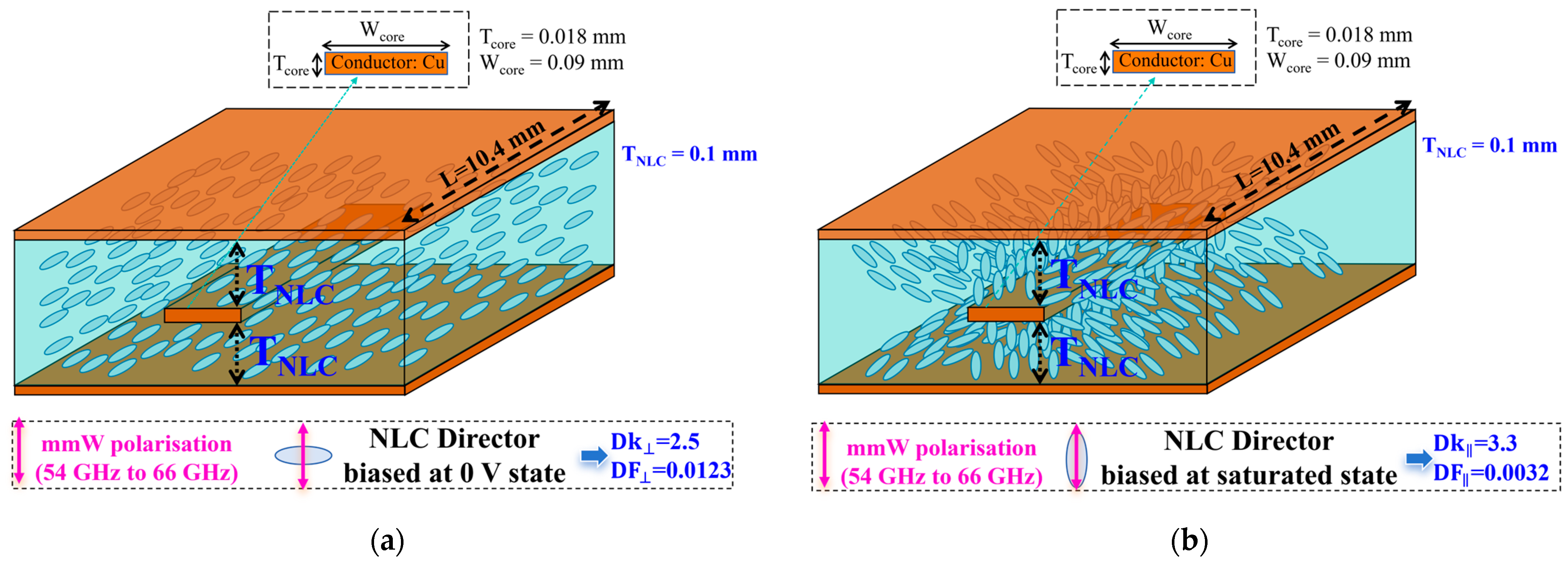Figure 4. Geometry and material details for our NLC-filled strip line phase shifter tuned between (a) the 0 V bias state of NLC and (b) the saturated bias state of NLC.
