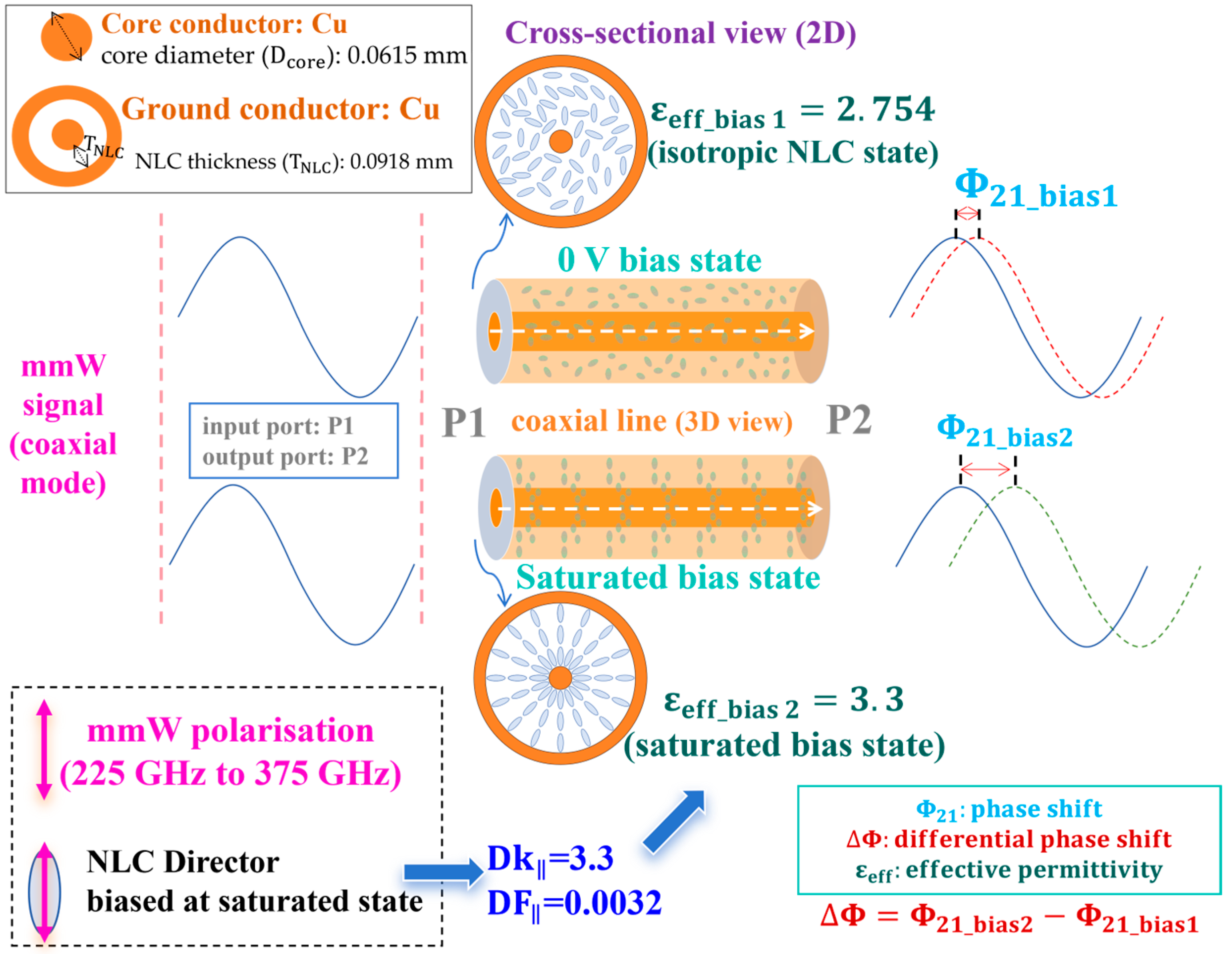 Figure 5. Geometry and material details for our NLC-filled coaxial phase shifter tuned between the 0 V bias state (isotropic NLC) and the saturated bias state of NLC.