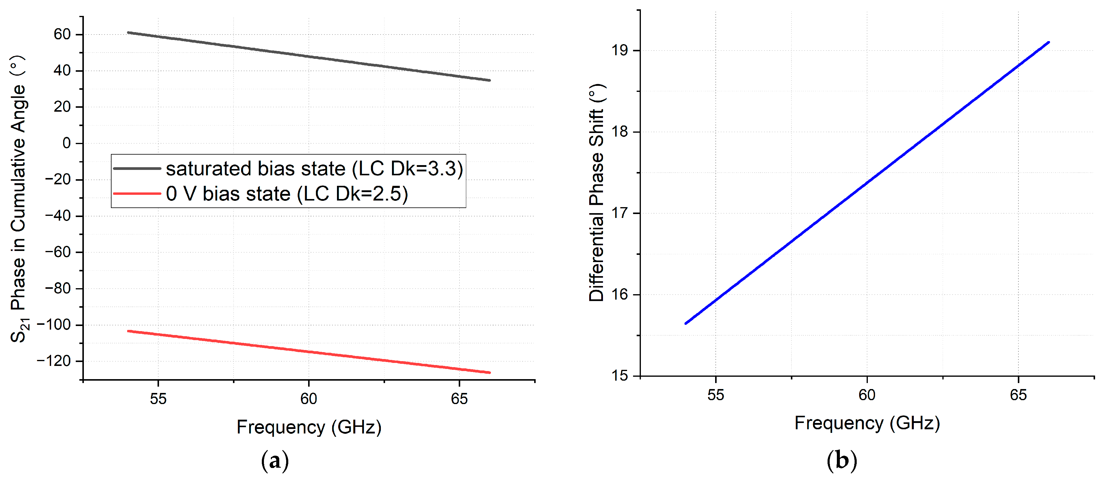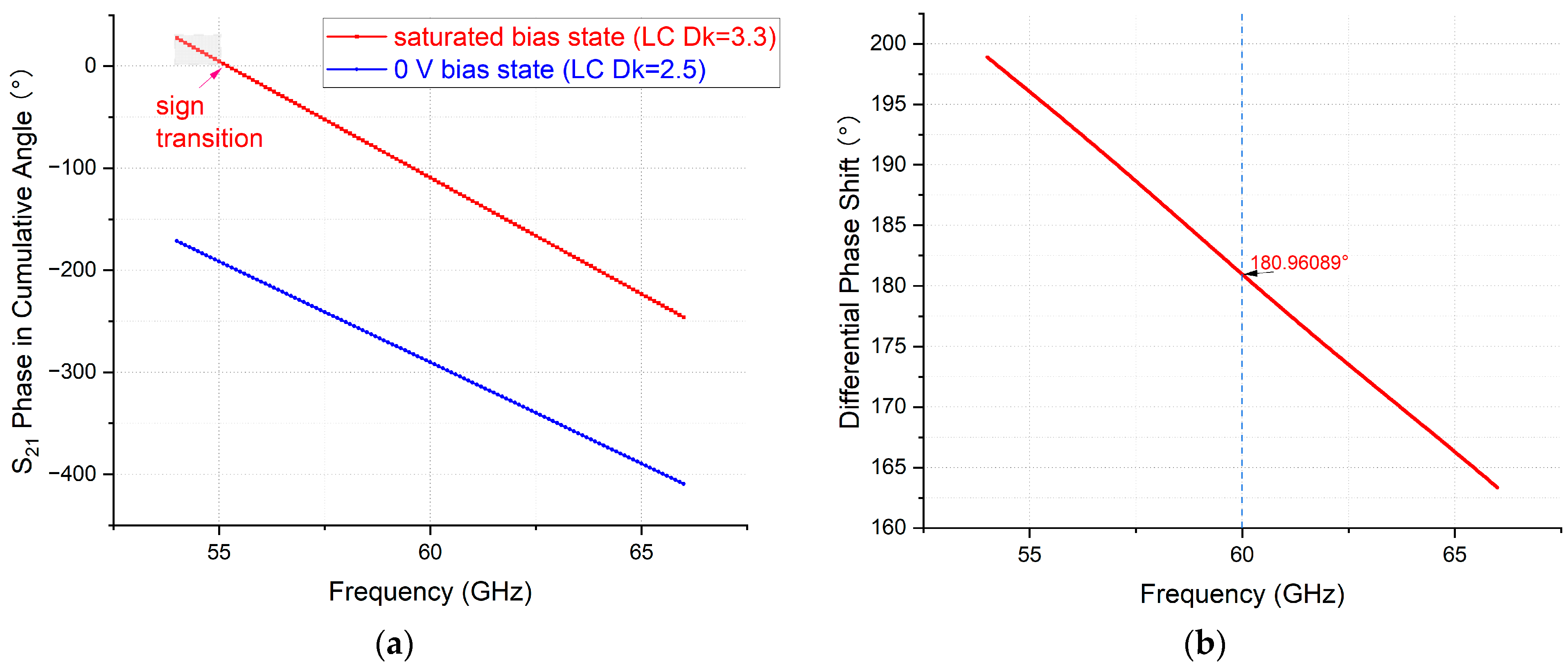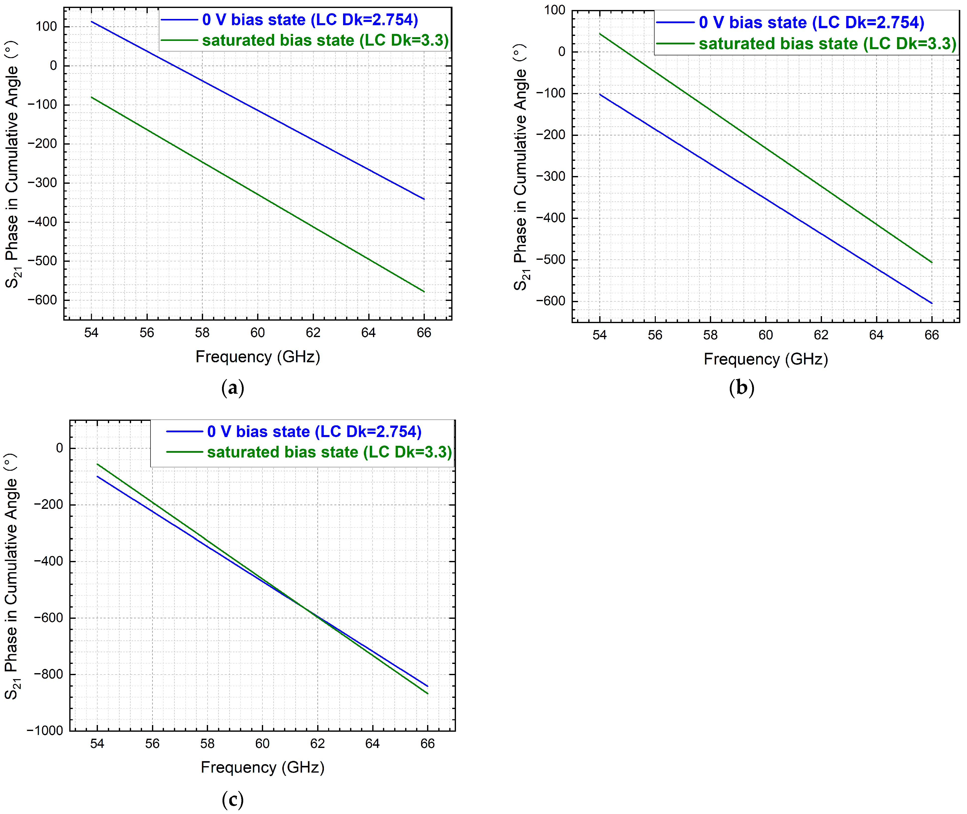 Figure 7a presents the cumulative angular (cang) phase results from 54 GHz to 66 GHz for an NLC-filled strip line phase shifter with a line length of 10.4 mm (geometry and material detailed in Figure 4 shown earlier). The cross-sectional geometry was designed for 50 Ω impedance matching at the saturated tuning state of the NLC (Dk = 3.3, DF = 0.0032). The DPS corresponding to ( ) m a x as defined in Equation (2), was derived by directly subtracting the phase curves under reference bias (0 V) and saturated bias, as shown in Figure 7b. The resulting DPS exhibits a declining trend over frequency, which contradicts the theoretical expectation from Equation (2) that DPS should increase monotonically with frequency.
