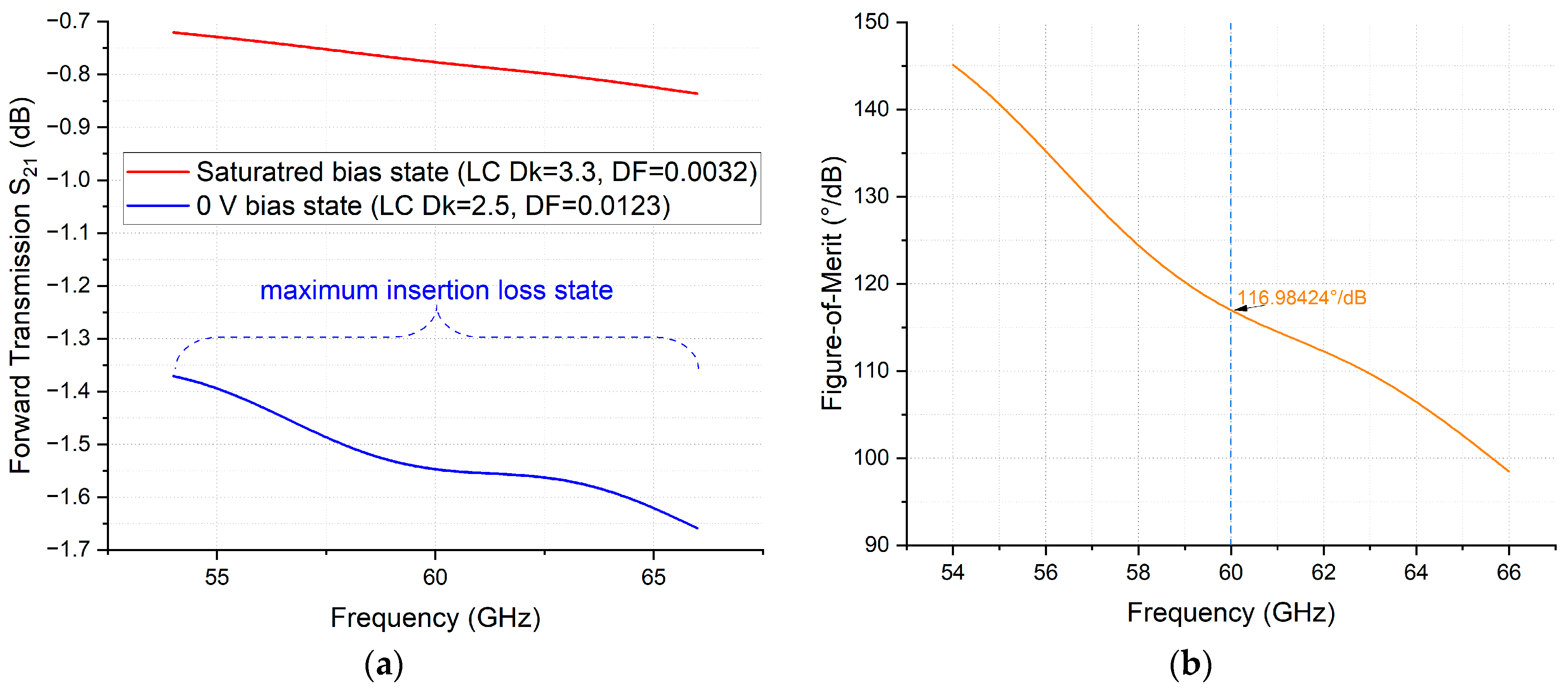 Figure 8. Characterisation of NLC-filled strip line phase shifter from 54 GHz to 66 GHz: (a) Insertion loss; (b) FoM, derived from erroneous processed DPS data presented in Figure 7b.