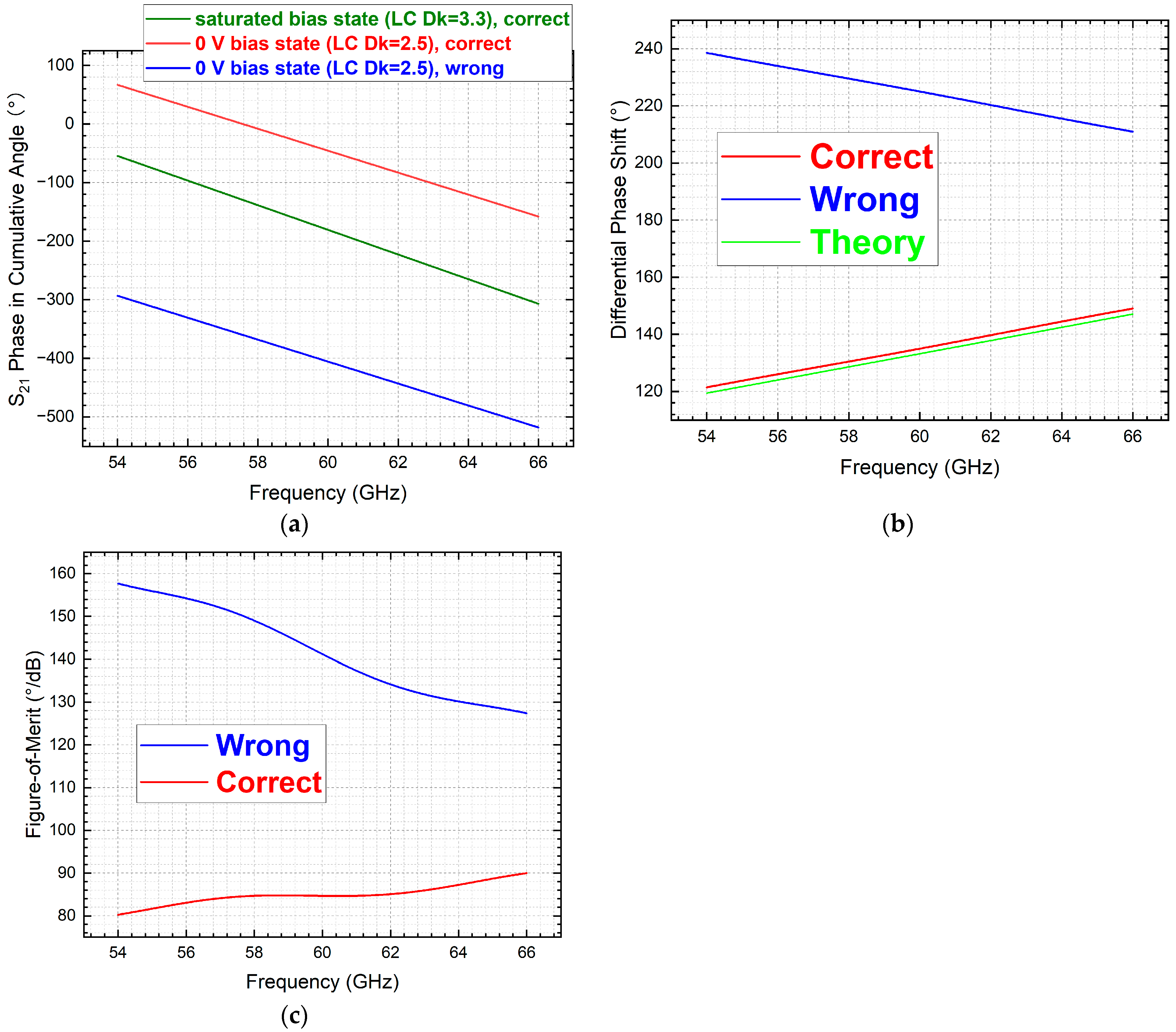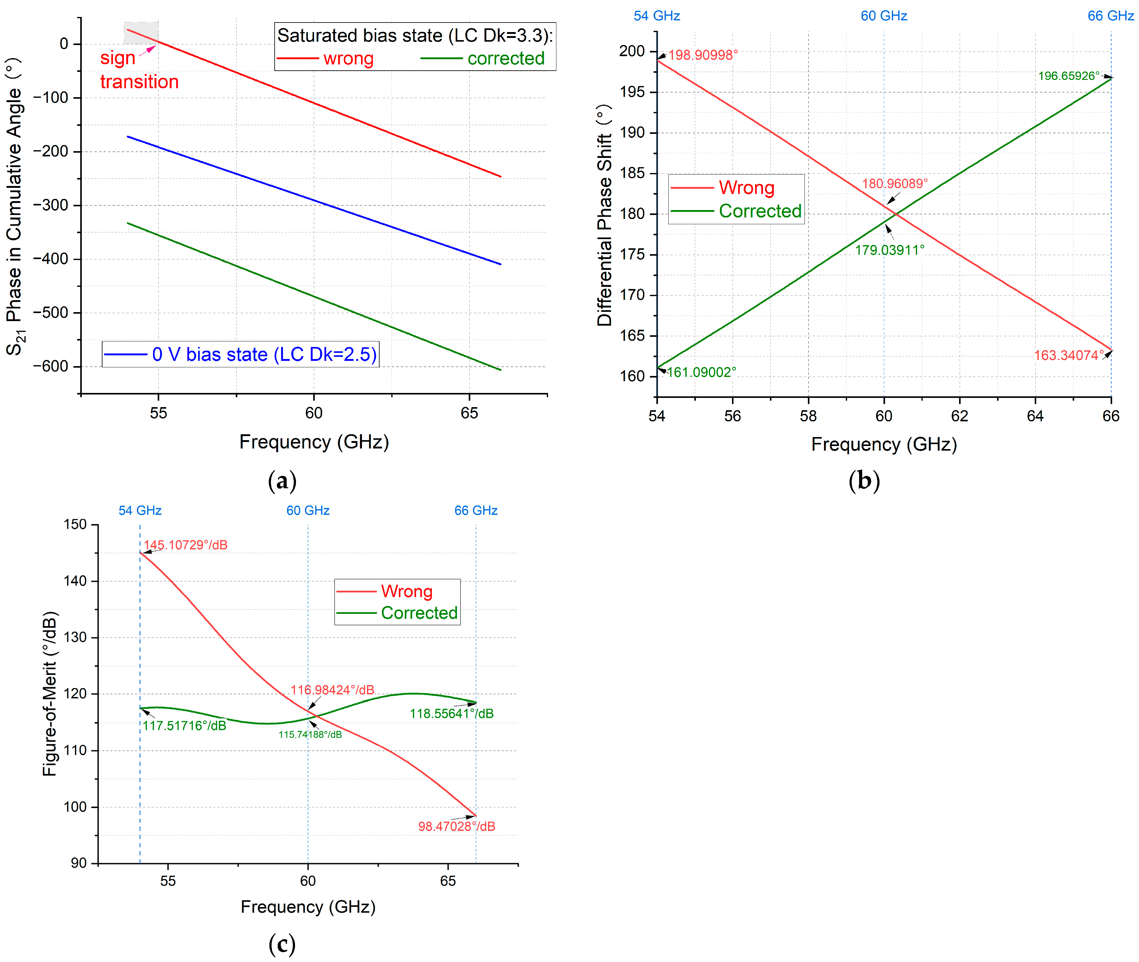 Interestingly, at 60 GHz, a seemingly minor discrepancy of 1.92178° between the faulty and corrected DPS values leads to fundamentally different frequency responses in performance evaluation. This highlights the critical sensitivity of the FoM and its frequency response to sign transitions in cang phase of post-processing. As evidenced in Figure 10c, the erroneous processing method paints a pessimistic picture of the NLC strip line phase shifter’s performance above 54 GHz, suggesting significant degradation. In contrast, the corrected data reveals a stable FoM across 54–66 GHz, affirming the device’s robustness for high-frequency applications like 5G/6G beamforming.