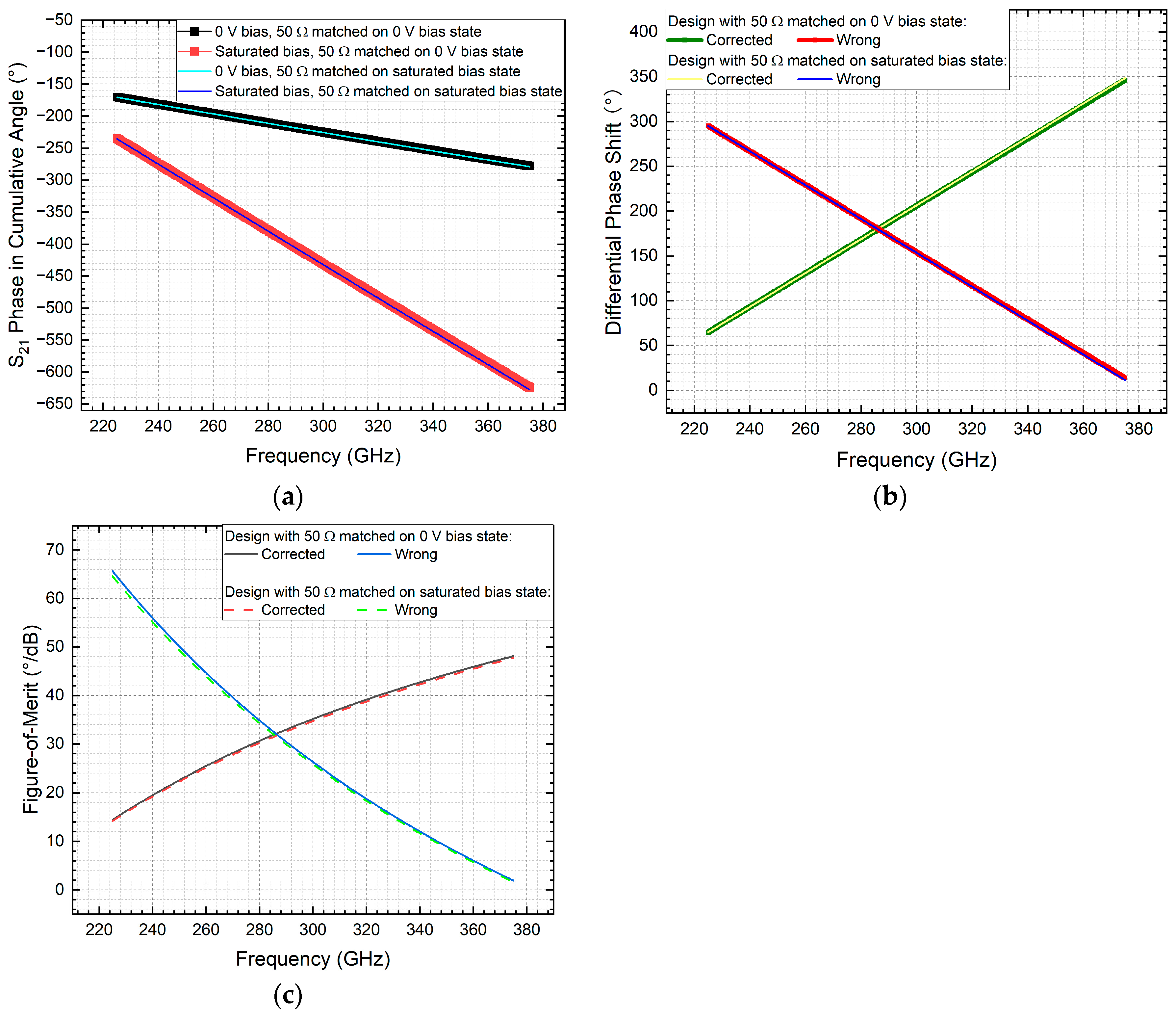 Similarly, the sign-transition vulnerability identified in Vulnerable Case 2 (the NLC-filled coaxial phase shifter) was addressed using a comparable phase correction approach. The corrected cang phase results are presented in Figure 11a, while Figure 11b,c compare the derived DPS and FoM against the previously flawed results. These comparisons reveal dramatically different frequency responses across the 225–375 GHz band. The erroneous post-processing method suggested a pessimistic performance degradation for both DPS and FoM with increasing frequency. In contrast, the corrected data demonstrates a promising increase in FoM with frequency. Although the absolute FoM level remains significantly lower than that observed in the corrected 60 GHz strip line case, this outcome highlights substantial optimisation potential for NLC-based coaxial phase shifters operating in the sub-mmW (THz) range.