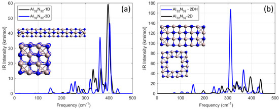 For the case of Al32N32, which was created after elongation of the original cubic Al4N4 building block along two vertical directions, the four strongest resonance frequencies were calculated at 394, 438, 337, and 325 cm−1 with corresponding IR-intensity values of 34, 28, 23, and 15 km/mol. For the case of Al32N32-1D, the strongest resonance was calculated at 396 cm−1 with an IR-intensity value of 59 km/mol, almost three times smaller than the strongest frequency resonance of defected Al32N32-2DH, which was calculated at 311 cm−1 with an IR-intensity value of 168 km/mol. In addition, the frequencies at which the resonance peaks from the defected Al32N32–2DH occur were within a range between 152 and 428 cm−1. In conclusion, as structural dimensionality increases, the number of IR-active modes grows, but the maximum IR-intensity peaks were calculated for the 2D system, suggesting an optimal balance between symmetry and vibrational delocalization. All structures were dynamically stable, with no imaginary frequencies observed.
