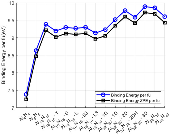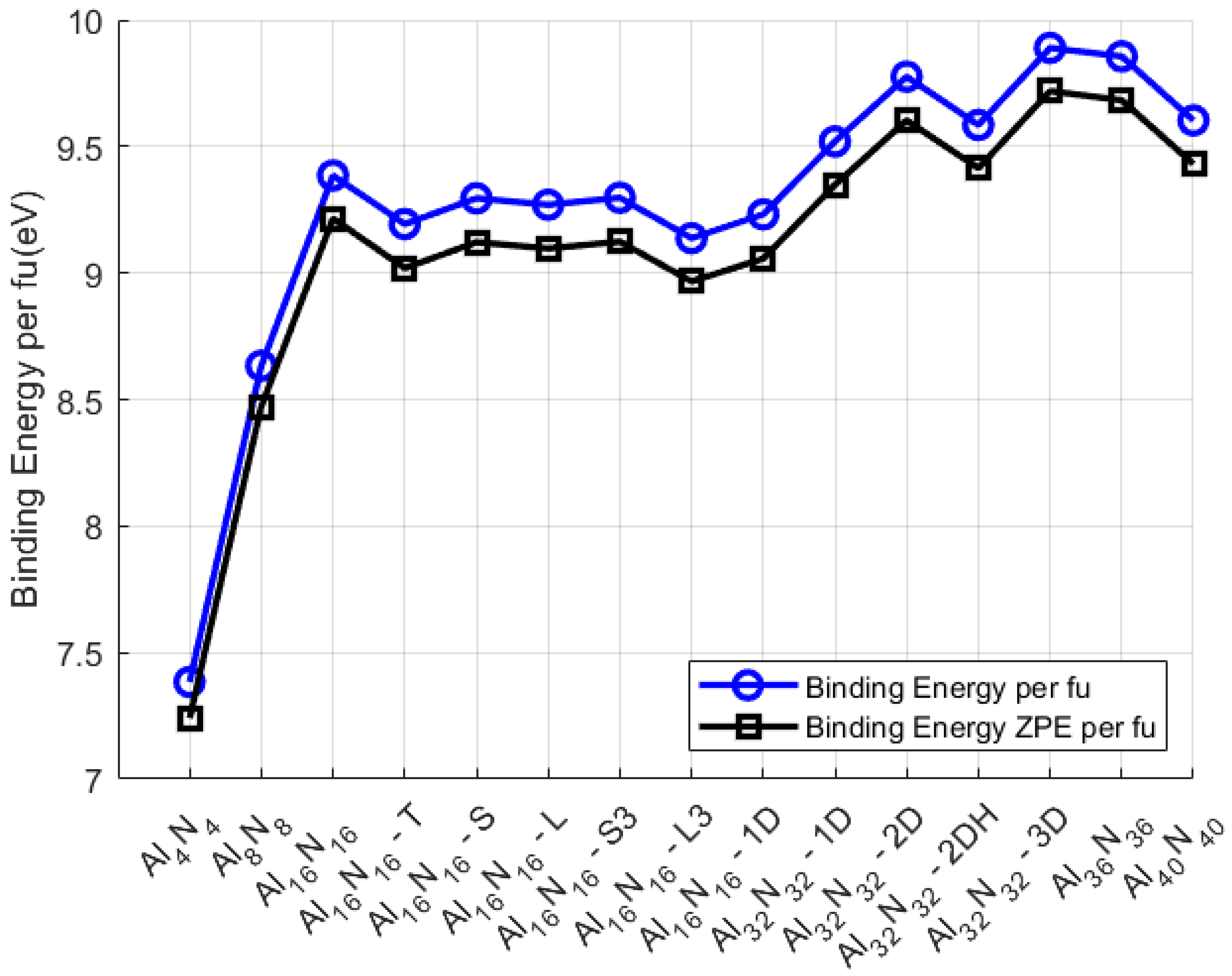 x NPs, the binding energy (BE) per formula unit (f.u.) was calculated using both self-consistent field (SCF) energies and zero-point vibrational energy (ZPE)-corrected values. It should be noted that the binding energies reported here are referenced to isolated Al and N atoms to ensure internal consistency among different cluster geometries. While this convention may overestimate absolute cohesive values, it accurately reflects relative stability trends across the studied Al
