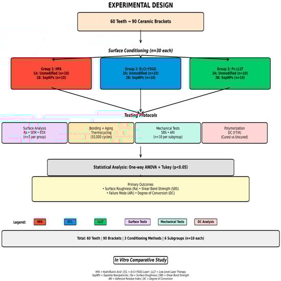 The prevailing exploration was established on the proposition that there will be no significant difference in the Ra and bond integrity of ceramic brackets pretreated with ECL and Pc-LLLT compared to HFA. Moreover, it was also anticipated that the bond strength of unmodified orthodontic adhesive utilized for bonding ceramic brackets to enamel would be comparable to that of Sep-NPs modified orthodontic adhesive, with no significant difference in degree of conversion (DC). Consequently, the study seeks to evaluate the influence of surface pretreatment of ceramic brackets via ECL and Pc-LLLT on the DC, Ra, and bond integrity of ceramic brackets to enamel employing both unmodified and Sep-NPs modified orthodontic adhesives.