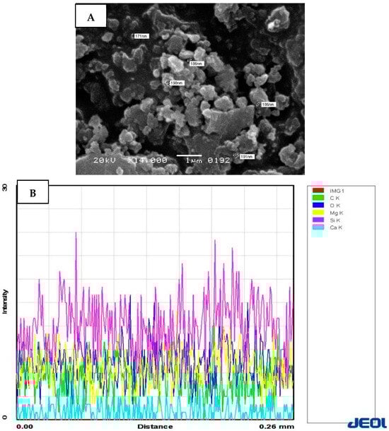 (A) Scanning electron micrograph of sepiolite nanoparticles showing aggregated morphology with individual particles ranging from 107 to 186 nm in diameter. The nanoparticles exhibit an irregular, clustered arrangement with rough surface texture. Magnification: ×14,000; Scale bar: 1 μm; Accelerating voltage: 20 kV. (B) The EDX graph shows X-Axis (Horizontal): “Distance” from 0.00 to 0.26 mm (260 μm). This is the path the electron beam traveled across your sample. Y-Axis (Vertical): “Intensity” (signal strength). Higher peaks = more of that element at that location. The elemental distribution via EDX shows Oxygen (O K, dark blue): Highest overall intensity 61%, Silicon (Si K, magenta) 20%, Magnesium (Mg K, yellow) 13%, Carbon (C K, green) 4% and Calcium (Ca K, cyan) 2% (minor impurity).