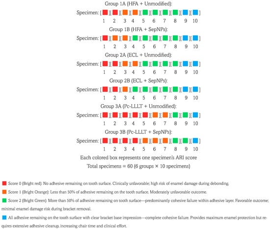 In marked contrast, Group 3A (Pc-LLLT + unmodified: 5.23 ± 0.32 MPa) fell below the 6 MPa minimum threshold, indicating clinically inadequate bonding performance. Group 3B (Pc-LLLT + SepNPs: 6.16 ± 0.48 MPa), while technically meeting the minimum 6 MPa threshold, provides no safety margin for clinical variation. The corresponding ARI score distribution in Groups 3A and 3B (50% and 40% Score 0, respectively) further confirms inadequate bonding, with failure occurring predominantly at the enamel-adhesive interface rather than through cohesive fracture. These findings emphasize that Pc-LLLT ceramic bracket conditioning, even when combined with nanoparticle-enhanced adhesives, does not provide clinically reliable bonding performance for orthodontic applications.