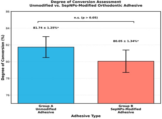 DC comparison showing no significant difference between unmodified (81.74 ± 1.25%) and SepNPs-modified (80.05 ± 1.34%) adhesives (p > 0.05). Both groups marked with a indicate the same statistical subset.