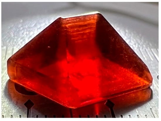 Co(NH4)2(SO4)2·6H2O single crystal was obtained through slow evaporation. A total of 7.56 g (30 mmol) Co(NO3)2·6H2O and 7.93 g (60 mmol) (NH4)2SO4 with purity of 99.9% were weighed and dissolved in a clean 250 mL glass beaker using 150 mL deionized water to prepare a 0.2 mol/L solution. The solution was stirred at a constant temperature of 60 °C in a water bath for 1 h to ensure complete reaction, resulting in a purple–red, clear, and transparent solution. The beaker was placed on an evaporating dish to allow for slow evaporation of the solvent at room temperature, leading to the formation of abundant crystals. The small and well-shaped single crystals without visible defects were selected as seed crystals. The seed crystal was placed at the bottom of a clean 150 mL glass beaker containing the above solution. The beaker was then sealed with a layer of parafilm, and approximately 20 evenly distributed small holes were pierced in the parafilm using a needle with a diameter of 1 mm. The solvent was allowed to evaporate slowly at room temperature, ultimately yielding a large size (20 × 15 × 9.5 mm3) single crystal, as shown in Figure 1.