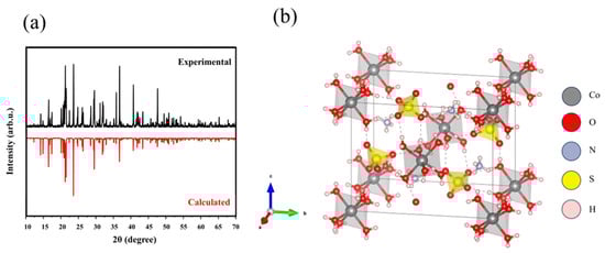 Structurally, Co(NH4)2(SO4)2·6H2O is isomorphous with other M2+ Tutton salts (M = Mn, Fe, Ni, and Cu), all crystallizing in the monoclinic P21/c (or equivalent P21/a) symmetry with similar hydrogen-bonding frameworks [18]. The thermal decomposition and dehydration behavior of this class of salts, including the cobalt analogue, have been investigated previously by thermogravimetric analysis [19,20]. Figure 2b illustrates the structure of Co(NH4)2(SO4)2·6H2O.