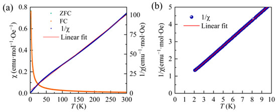 The temperature-dependent magnetic susceptibility (χ) of Co(NH4)2(SO4)2·6H2O was measured under zero-field-cooled (ZFC) and field-cooled (FC) protocols in the range of 2–300 K with an external field of μ0H = 1 T, as shown in Figure 3a. The complete overlap of the ZFC and FC curves demonstrates negligible thermal hysteresis, and no clear signatures of magnetic phase transitions are detected within this temperature interval, confirming the paramagnetic nature of the compound. To further elucidate the magnetic ground state, the inverse susceptibility χ−1(T) was analyzed according to the Curie–Weiss law,