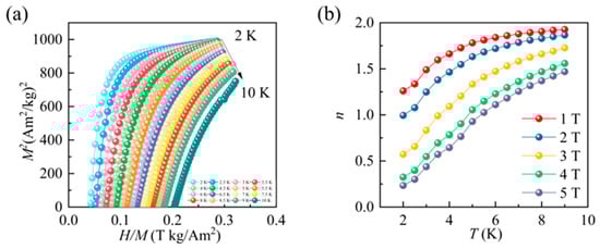 Belov–Arrott plots and the field exponent n are widely employed to determine the order of magnetic phase transitions. Figure 6a presents the Belov–Arrott curves obtained from the M2-H/M relations in the temperature range of 2–10 K. None of the curves intersect the origin, indicating that the critical temperature lies outside the investigated window, and, thus, no phase transition occurs within the measured range. According to Banerjee’s criterion [24], all the curves exhibit positive slopes, suggesting that if a transition occurs at lower or higher temperatures, it should be of second-order character. In addition, Law [25] proposed another method to determine the type of magnetic phase transition, which is to calculate the field exponent n to determine the order of the magnetic phase transition. Figure 6b illustrates the distribution of the exponent n in the temperature range of 2–9 K. The magnetic entropy change (ΔSM) as a function of the applied magnetic field (H) can be described by a power-law relation: