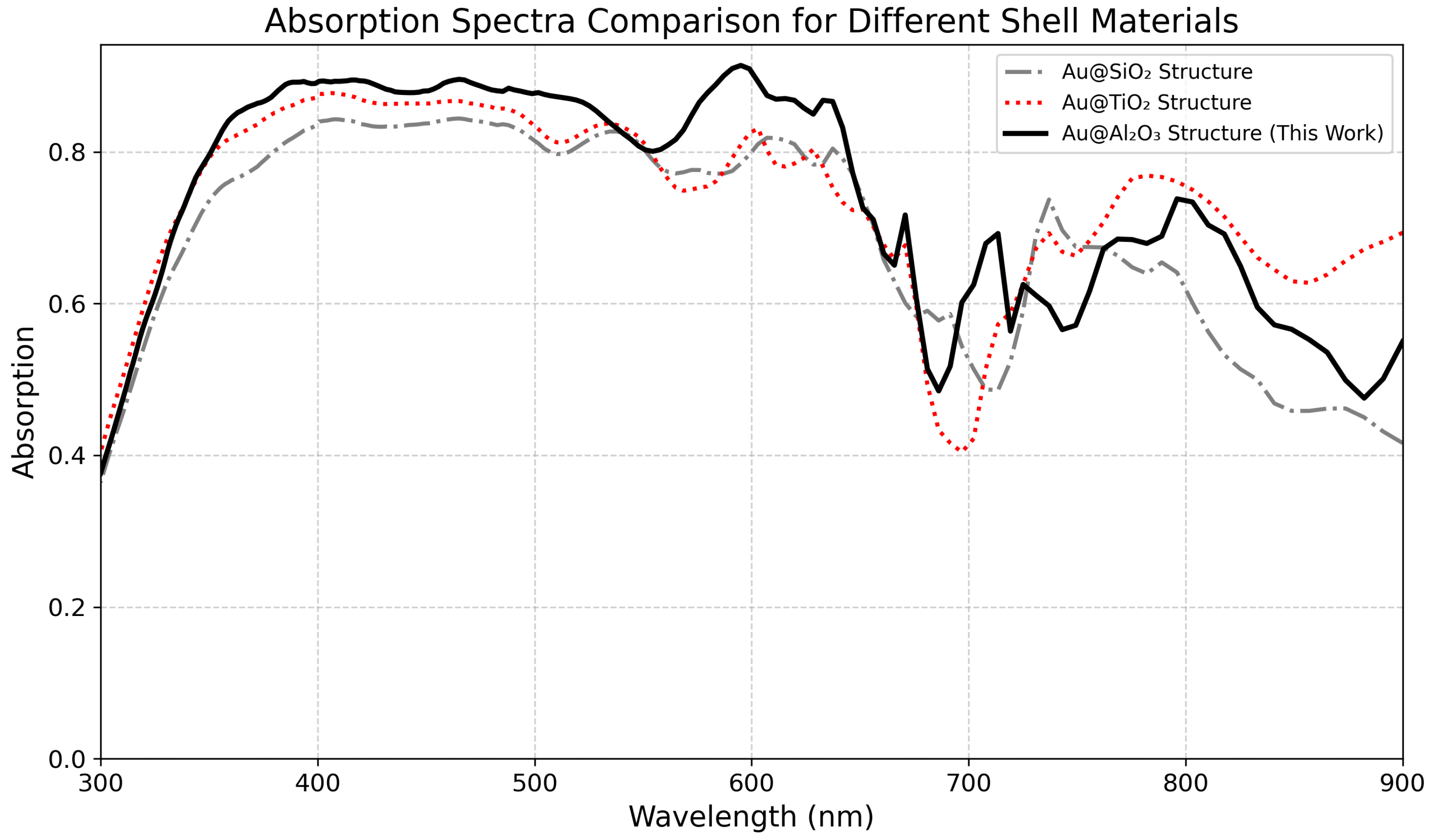 Jiang, Y.; Li, C. Enhancing Light Absorption in Perovskite Solar Cells Using Au@Al2O3 Core–Shell Nanostructures: An FDTD Simulation Study. Crystals 2025, 15, 1023. https://doi.org/10.3390/cryst15121023
