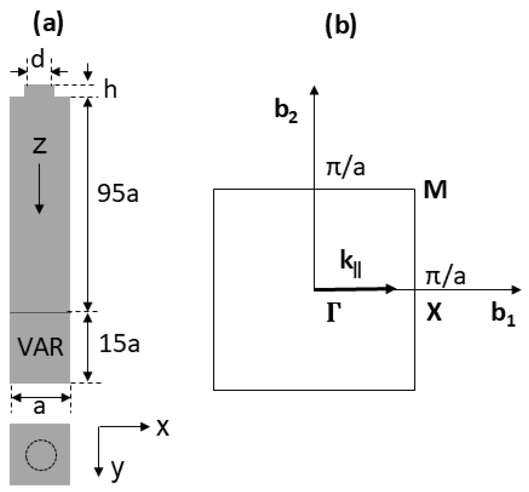 We consider a semi-infinite isotropic elastic medium, unbounded in the plane, with a surface at and extending to negative infinity. The flat surface is perturbed by a corrugated structure in the form of protruding cylinders extending periodically in the xy plane, forming a 2D surface-PnC in a square lattice ( point group). The PnC structure establishes a periodic surface profile along the plane, replacing the flat surface condition.
