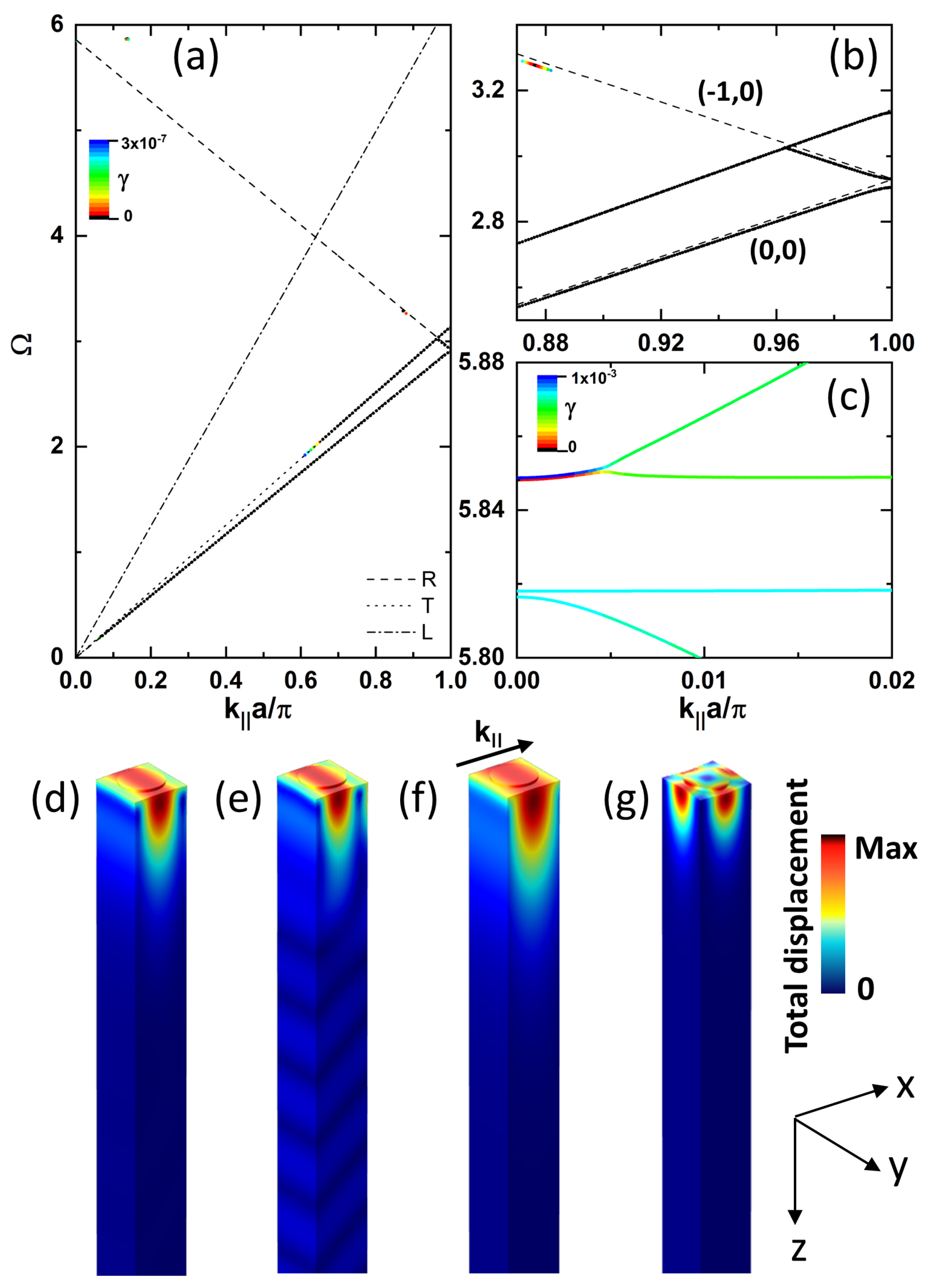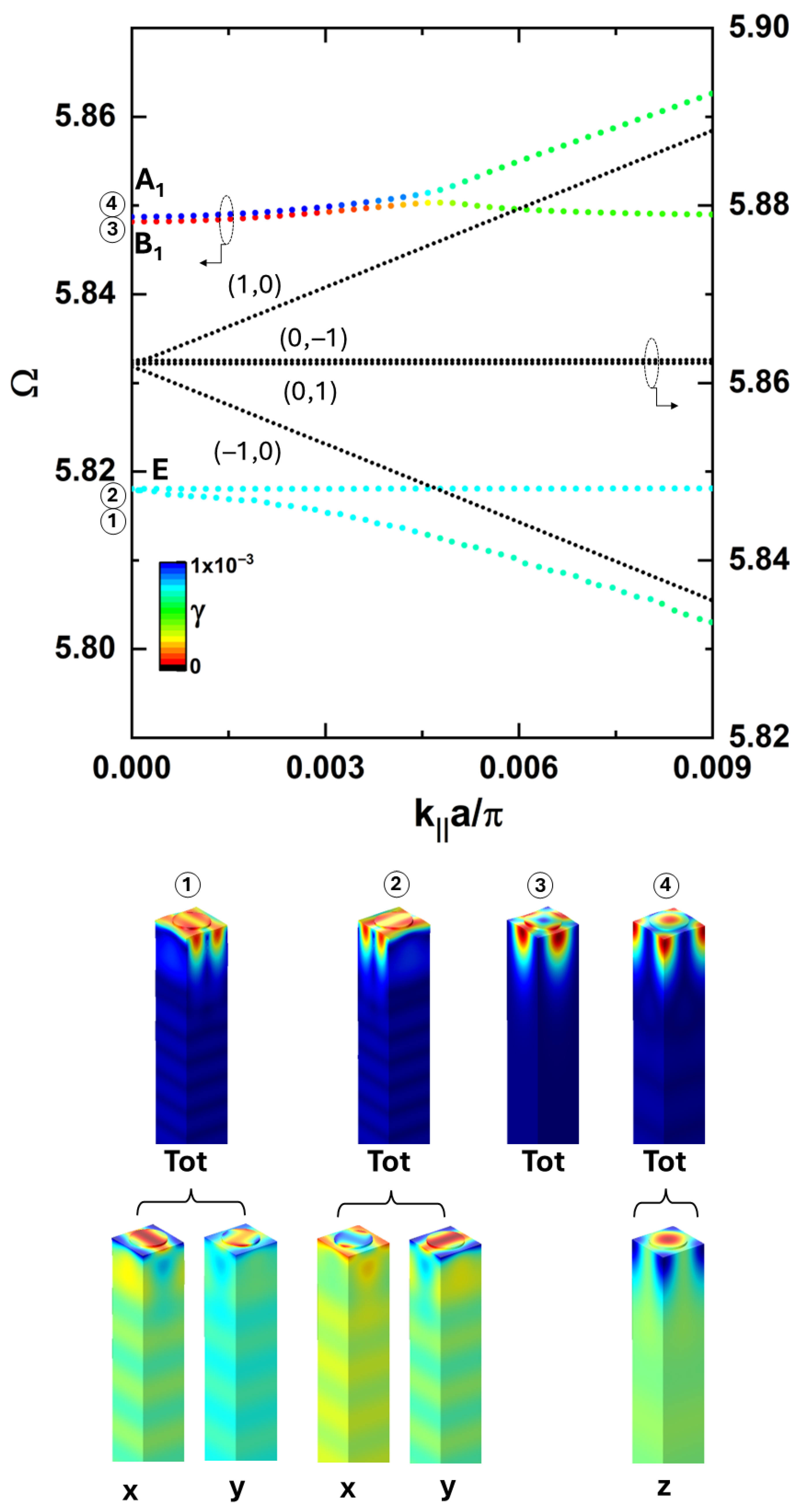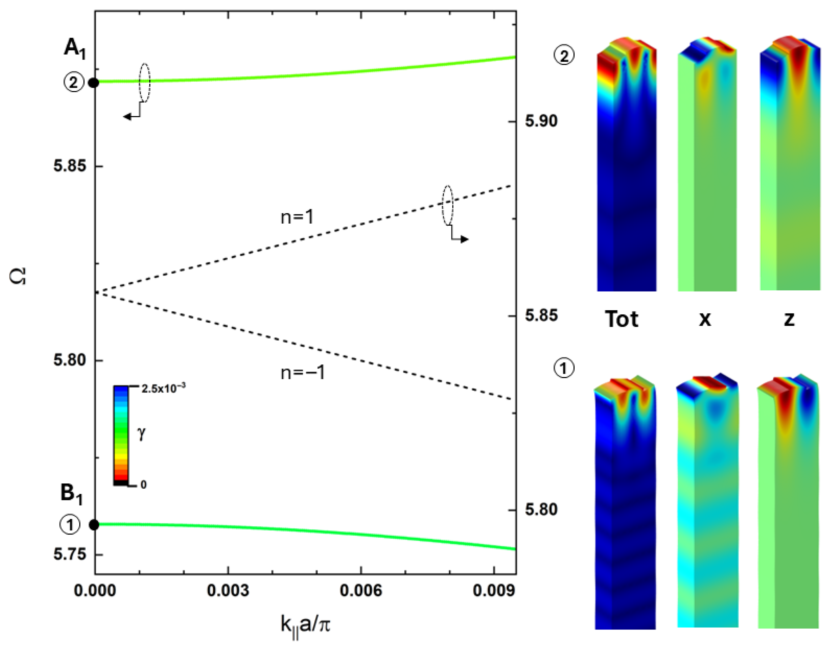 6]. The leaky upper branch exhibits the presence of modes for which the leakage to the bulk is suppressed, and they have been identified as the class of states known as bound states in the continuum (BIC). This occurs in a specific direction between the crystallographic [100] and [110] directions and in the exact [110] direction [