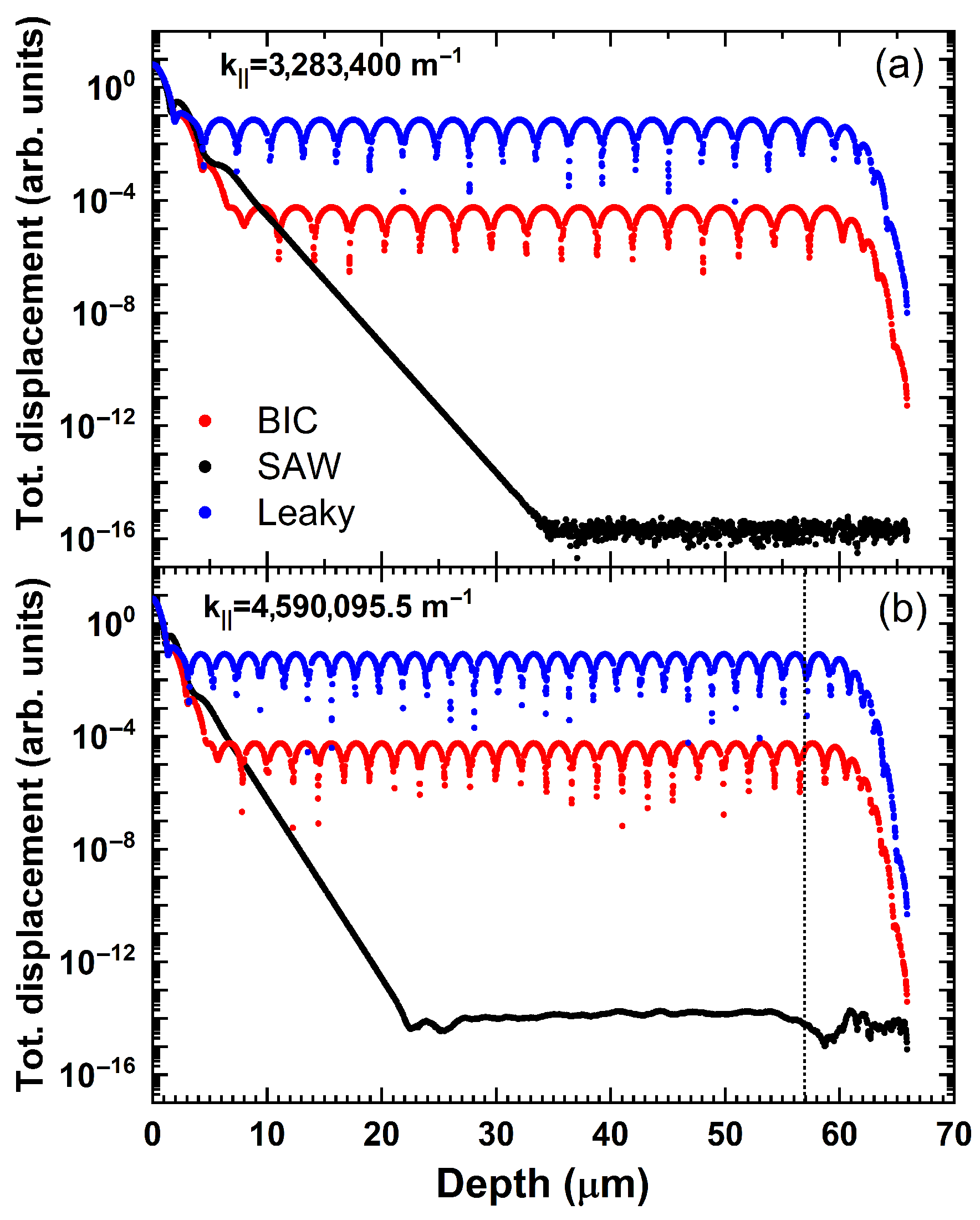 Even if periodic boundary conditions place a constraint on the lateral dimensions of the problem, it is necessary to address the truncation of the unit cell in the z direction when working with FEM. When searching for SAWs sustained by the SPnC, it is necessary to ensure that the length of the bounded domain in the z direction is greater than the penetration depth of the SAWs. Therefore, the depth of the structure must encompass several wavelengths to obtain a reliable solution that accurately describes the vanishing acoustic field in the direction perpendicular to the surface. An unintended consequence of domain truncation is the emergence of multiple solutions from the resulting plate-like structure. Different sorting methods based on the mechanical energy distribution inside the structure have been used to distinguish the surface modes from the modes that satisfy the top and bottom surface boundary conditions simultaneously.