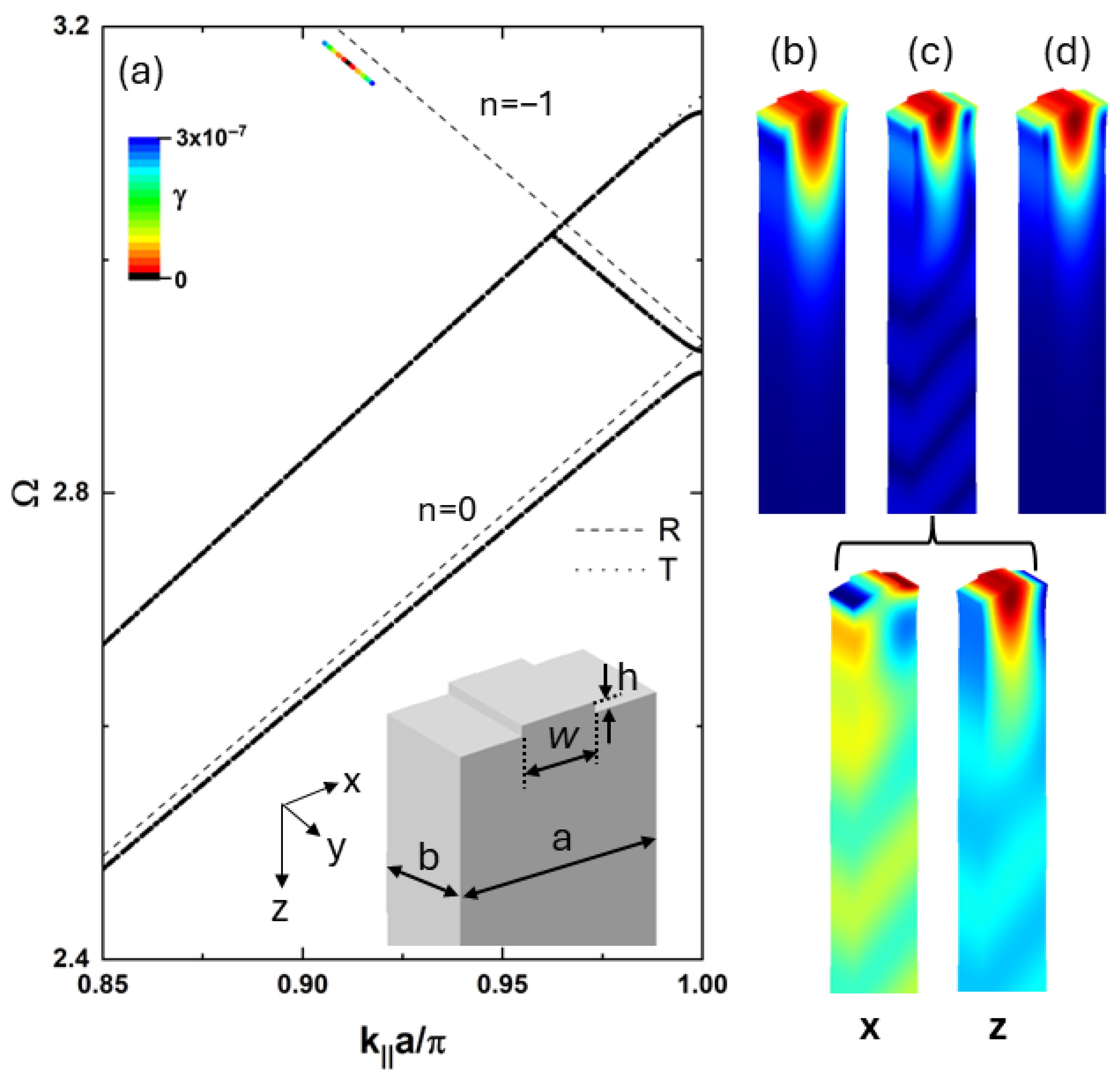 Figure 5 illustrates the robustness of the BIC against variations in the structural parameters, specifically the groove width. The frequency of the BIC varies continuously from the existence condition, as determined by the EL approximation, to the critical value. The appearance of the