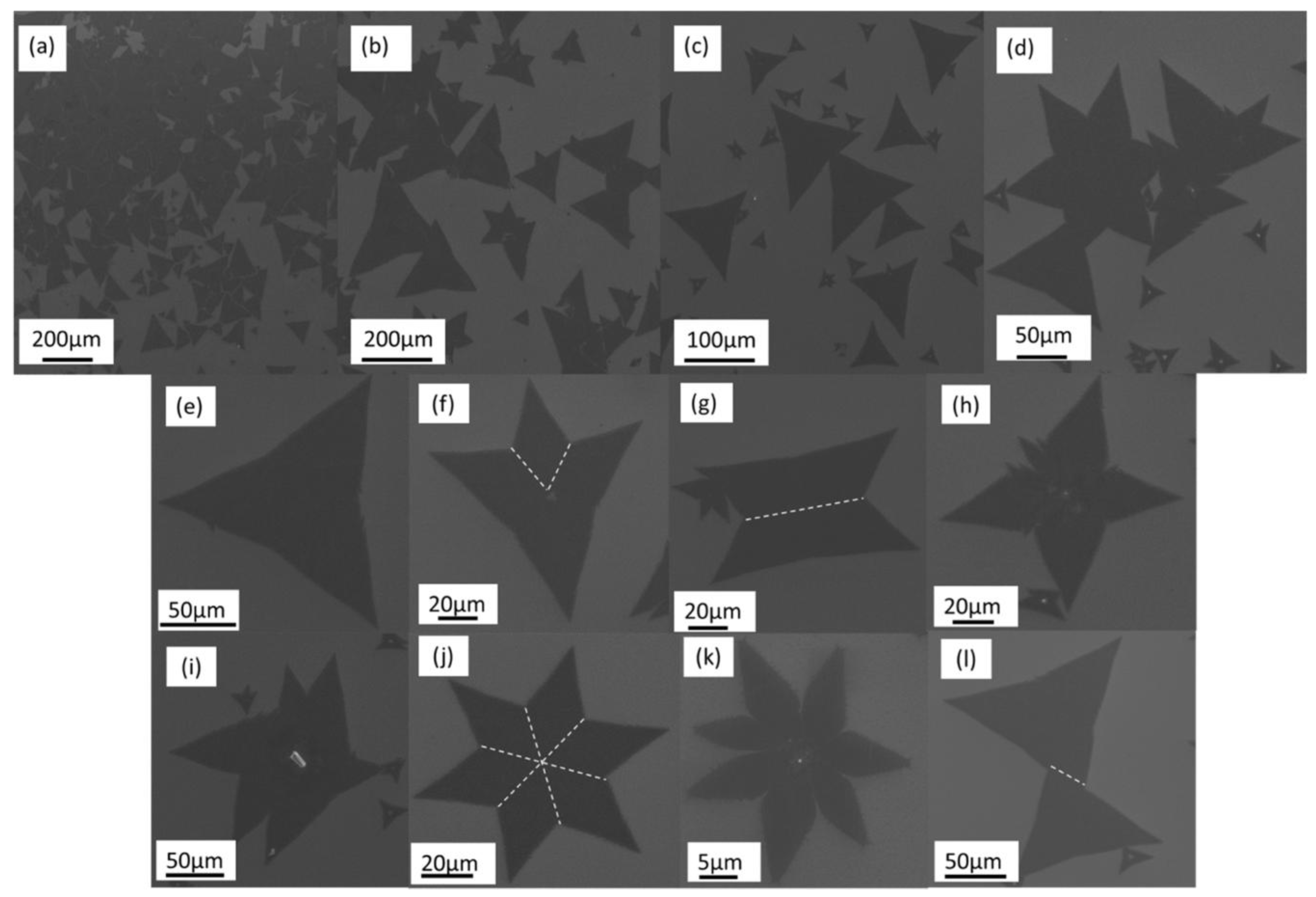 - Xu, M.; Ji, H.; Zheng, L.; Zhang, X.; Liu, P.; Chen, Y.; Wang, Y.; Zhang, J.; Zhang, Y.; Zhou, W.; et al. Reconfiguring Nucleation for CVD Growth of Twisted Bilayer MoS2 with a Wide Range of Twist Angles. Nat. Commun. 2024, 15, 562. [Google Scholar] [CrossRef] [PubMed]