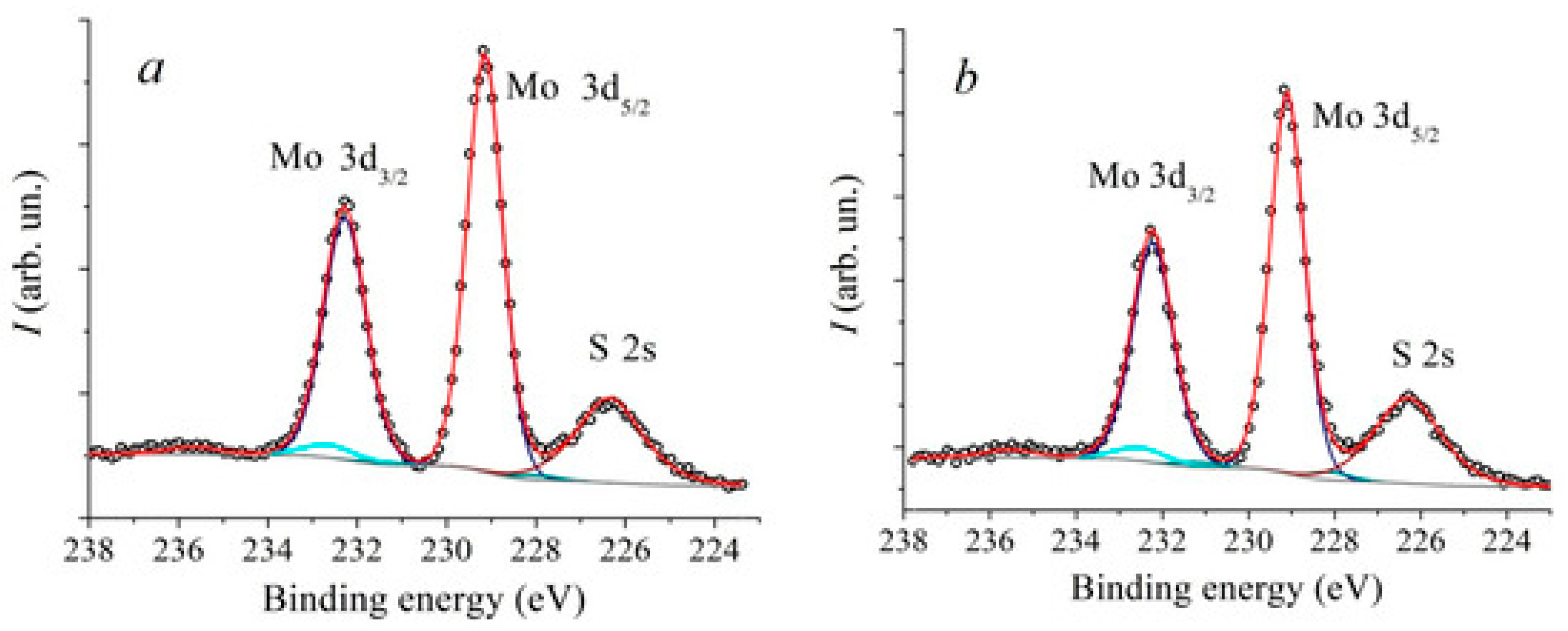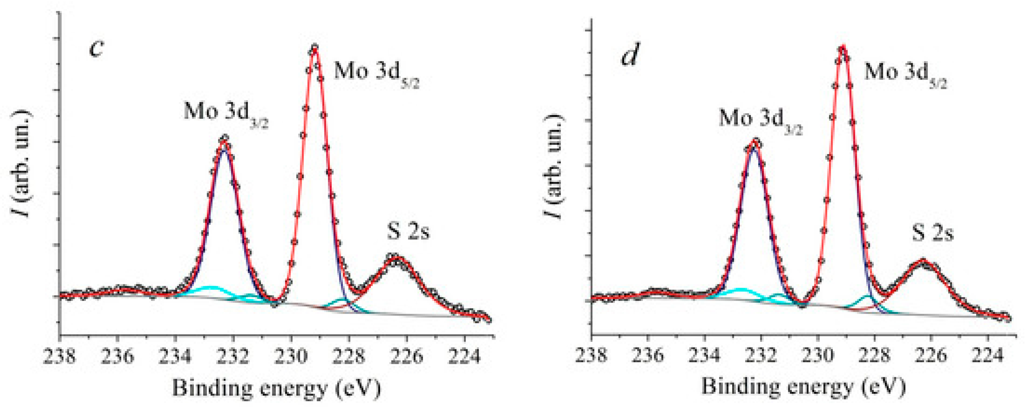 - Baker, M.A.; Gilmore, R.; Lenardi, C.; Gissler, W. XPS Investigation of Preferential Sputtering of S from MoS2 and Determination of MoSx Stoichiometry from Mo and S Peak Positions. Appl. Surf. Sci. 1999, 150, 255–262. [Google Scholar] [CrossRef]