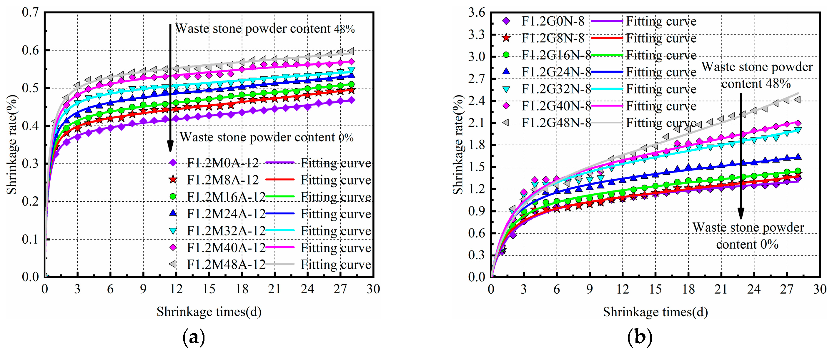 (1) The incorporation of waste stone powder adversely affects the volumetric stability of both cementitious materials. The drying shrinkage rate changes significantly at an early age (≤3 days) and stabilizes in later stages. Drying shrinkage increases with higher stone powder content. For the alkali-activated metakaolin material with waste stone powder, when the content reaches 48%, the 28-day shrinkage increases by 1.27 times. In the case of alkali-activated slag cementitious material with waste stone powder, when the content exceeds 32%, the shrinkage increases significantly by 1.5 times. A shrinkage model based on experimental data was established, with correlation coefficients R2 all above 0.9, effectively predicting this trend.