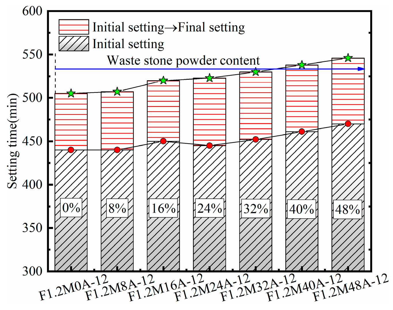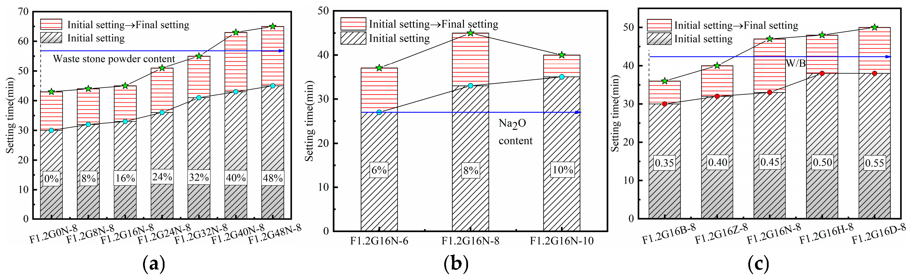 Figure 4 presents the setting time results of alkali-activated waste stone powder-slag cementitious materials. As shown in Figure 4a, both the initial and final setting times exhibited an approximately linear increase with higher waste stone powder content, yet remained shorter than those of the cement reference samples. At 48% waste stone powder content, the maximum initial and final setting times reached 45 min and 65 min, respectively, representing 50% and 51.16% increases compared to the F1.2G0N-8 sample. This demonstrates that increasing waste stone powder content effectively prolongs the setting time. From Section 2.1 material properties analysis, the finer waste stone powder particles adsorb onto slag particle surfaces during reaction, reducing the contact area between slag and alkaline solution. This decreases the curing reaction rate and consequently extends setting time. Figure 4b reveals that Na2O content showed insignificant influence on setting time. However, the initial setting time gradually increased with higher Na2O content. The setting characteristics primarily result from Ca2+ dissolution from slag under alkaline conditions, reacting with [SiO4]4− and [AlO4]5− to form C-(A)-S-H gel [28]. Elevated Na2O content increases OH concentration, causing Ca2+ to preferentially form Ca(OH)2 rather than directly producing C-(A)-S-H gel [29], thereby extending initial setting. Final setting time first increased then decreased with rising Na2O content, peaking at 45 min for the 8% Na2O sample—21.62% and 12.5% longer than 6% and 10% Na2O samples, respectively. Figure 4c demonstrates that higher W/B linearly prolonged both setting times. At W/B = 0.55, the maximum initial and final settings reached 38 min and 50 min, respectively, 26.67% and 38.89% longer than the W/B = 0.35 samples. This delay occurs because water acts as a reaction medium; thicker interparticle water films require more hydration products for solidification. Additionally, higher W/B dilute OH concentration, slowing Ca2+ dissolution from slag, and further extending the setting. Figure 5 shows that all samples exhibited an initial setting of >420 min and a final setting of >500 min. Setting times increased nearly linearly with waste stone powder content. When content rose from 0% to 48%, the initial setting extended from 440 min to 470 min, and the final setting from 505 min to 546 min, longer than the cement samples. This confirms waste stone powder delays setting by adsorbing onto metakaolin particles, hindering alkaline contact and slowing dissolution.
