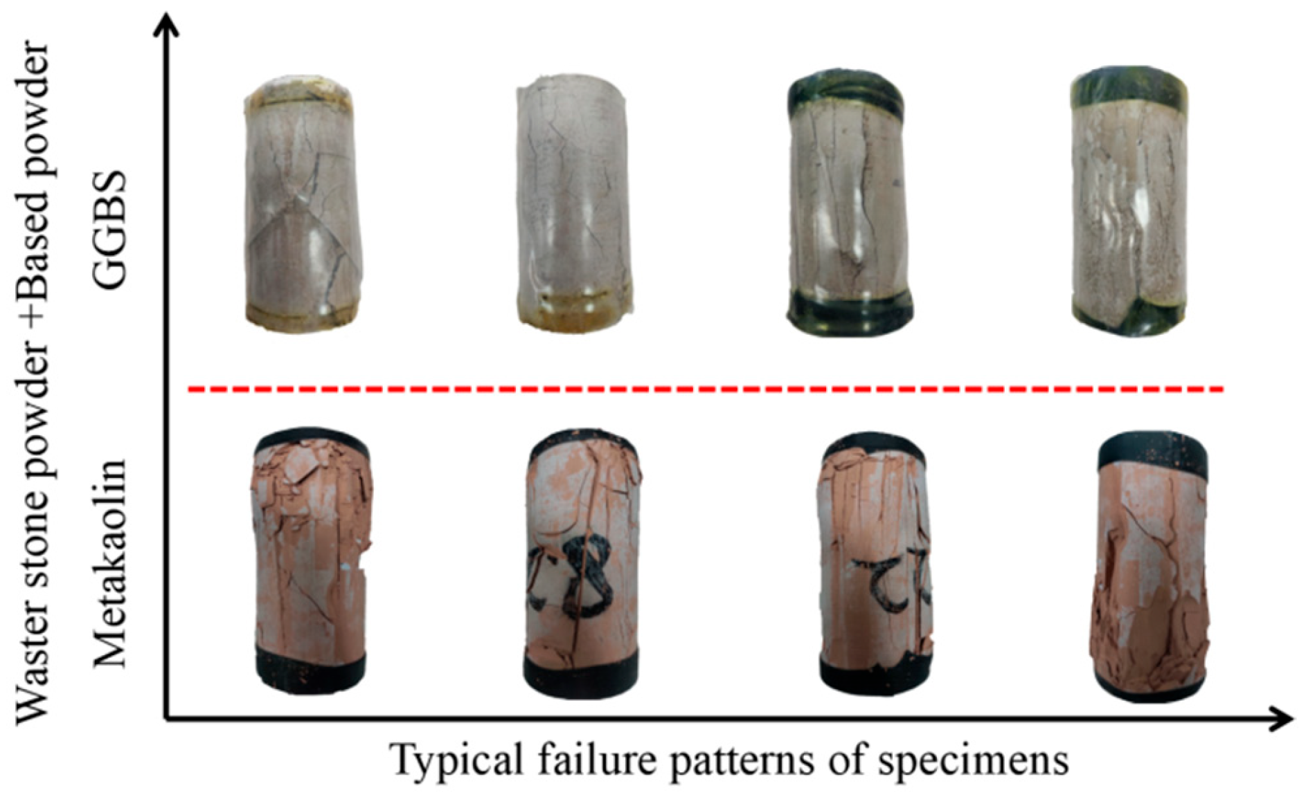Figure 8 shows the typical failure patterns of specimens. As shown in Figure 8, the loading and failure processes of waste stone powder composite cementitious materials with three different base powders are fundamentally similar. During initial loading, no obvious phenomena occur in the specimens. As the load increases, internal microcracks develop and form macroscopic cracks. As failure approaches, crack development enters an unstable stage where cracks widen and continuously extend and connect. The final failure characteristics show typical splitting failure patterns [32]. For waste stone powder alkali-activated slag specimens, the failure cracks exhibit multiple connected vertical cracks, mainly forming crack zones parallel to the vertical direction, along with completely penetrating vertical cracks. The waste stone powder alkali-activated metakaolin specimens mainly feature vertically penetrating cracks as the dominant failure mode. During compression, these specimens produce loud “bang” sounds and exhibit even more severe material spalling. The main consideration lies in the different base powders; alkali-activated slag materials primarily form hydration products such as C-S-H and N-A-S-H gels, while alkali-activated metakaolin mainly produces C-A-S-H and N-A-S-H gels. The key difference between them lies in the varying Ca/Si ratios that lead to differences in C-S-H gel hydration products. C-S-H gels can undergo relatively good viscous flow during compression [31], whereas C-A-S-H and N-A-S-H gels have three-dimensional network structures that exhibit greater brittleness during failure, macroscopically manifesting as more severe material damage.