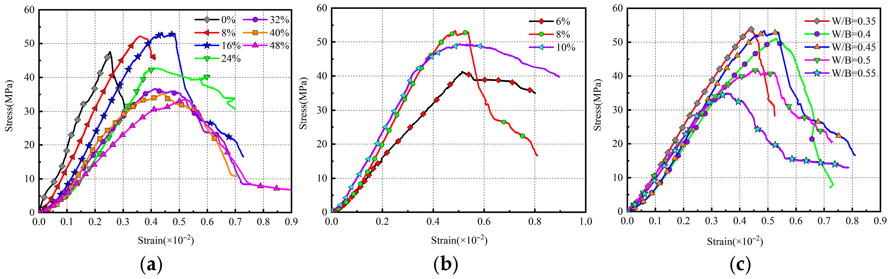 Figure 9. The stress–strain curves of alkali-activated slag cementitious materials incorporating waste stone powder. (a) Waste stone powder content; (b) Na2O content; (c) W/B.